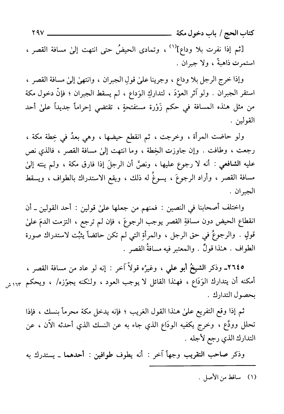 واختلف أصحابنا في النصين: فمنهم من جعلها على قولين: أحد القولين - أن انقطاع الحيض دون مسافةِ القصر يوجب الرجوعَ، فإن لم ترجع، التزمت الدمَ على قول. والرجوعُ في حق الرجل، والمرأةِ التي لم تكن حائضاً يثبُت لاستدراك صورة الطواف. هذا قولٌ. والمعتبر فيه مسافةُ القصر.