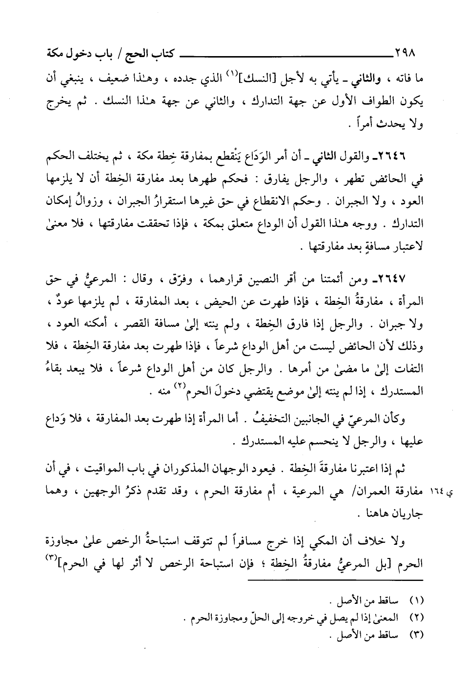 2647 - ومن أئمتنا من أقر النصين قرارهما، وفرّق، وقال: المرعيُّ في حق المرأة، مفارقةُ الخِطة، فإذا طهرت عن الحيض، بعد المفارقة، لم يلزمها عودٌ، ولا جبران. والرجل إذا فارق الخِطة، ولم ينته إلى مسافة القصر، أمكنه العود، وذلك لأن الحائض ليست من أهل الوداع شرعاً، فإذا طهرت بعد مفارقة الخِطة، فلا التفات إلى ما مضى من أمرها. والرجل كان من أهل الوداع شرعاً، فلا يبعد بقاءُ المستدرك، إذا لم ينته إلى موضع يقتضي دخولَ الحرم (2) منه.