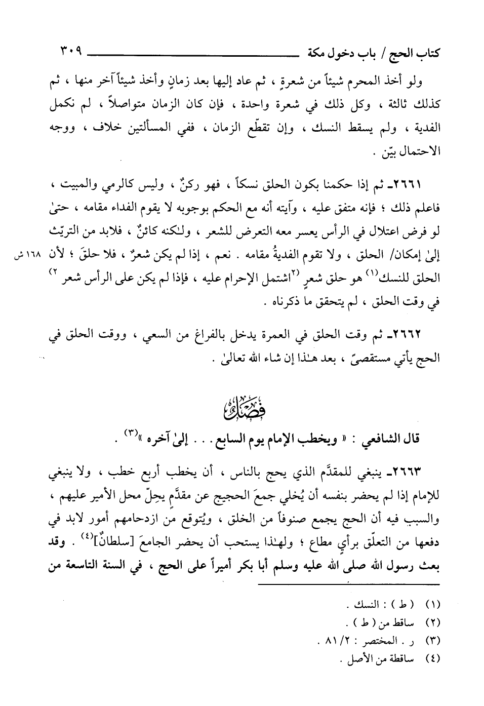 2662 - ثم وقت الحلق في العمرة يدخل بالفراغ من السعي، ووقت الحلق في الحج يأتي مستقصىً، بعد هذا إن شاء الله تعالى.
