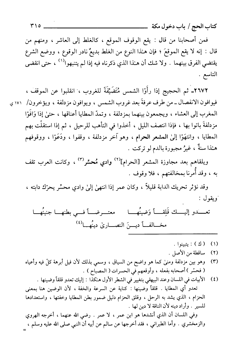 2672 - ثم الحجيج إذا رأَوْا الشمس مُتَضَيِّفَةً للغروب، انقلبوا عن الموقف، فيوافون الانفصال - من طرف عرفةَ بعد غروب الشمس، ويوافون مزدلفة، ويؤخرون المغرب إلى العشاء، ويجمعون بينهما بمزدلفة، وتمدّ المطايا أعناقها، حتى إذا وَافَوْا مزدلفةَ باتوا بها، فإذا انتصف الليل، أخذوا في التأهب للرحيل، ثم إذا استقلّت بهم المطايا، وانتهَوْا إلى المشعر الحرام، وهو آخر مزدلفة، وقفوا، ودَعَوْا، ووقوفهم هذا سنةٌ، غيرُ مجبورة بالدم لو تركت.