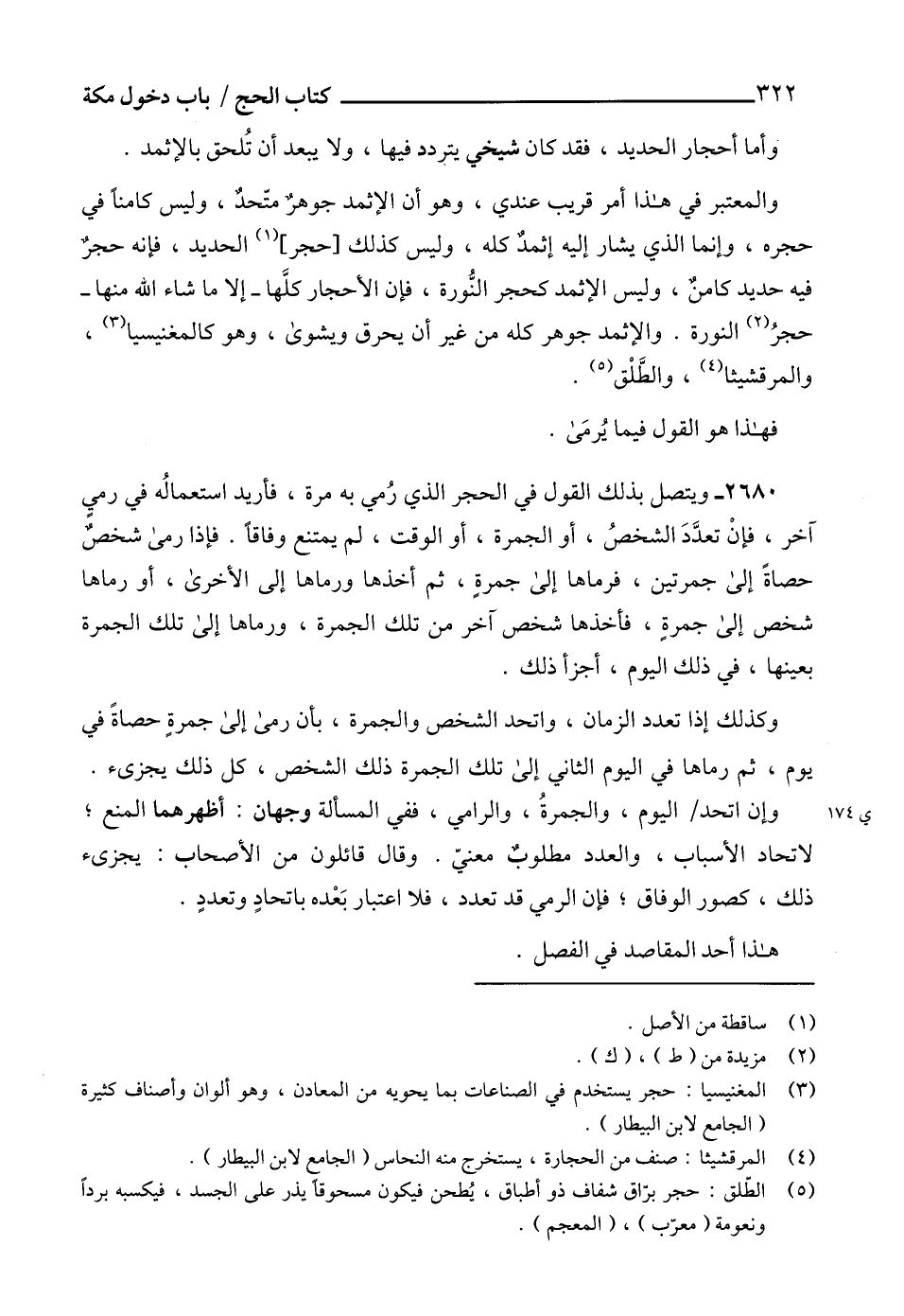 2680 - ويتصل بذلك القول في الحجر الذي رُمي به مرة، فأريد استعمالُه في رميٍ آخر، فإنْ تعدَّدَ الشخصُ، أو الجمرة، أو الوقت، لم يمتنع وفاقاً. فإذا رمى شخصٌ حصاةً إلى جمرتين، فرماها إلى جمرةٍ، ثم أخذها ورماها إلى الأخرى، أو رماها شخص إلى جمرةٍ، فأخذها شخص آخر من تلك الجمرة، ورماها إلى تلك الجمرة بعينها، في ذلك اليوم، أجزأ ذلك.