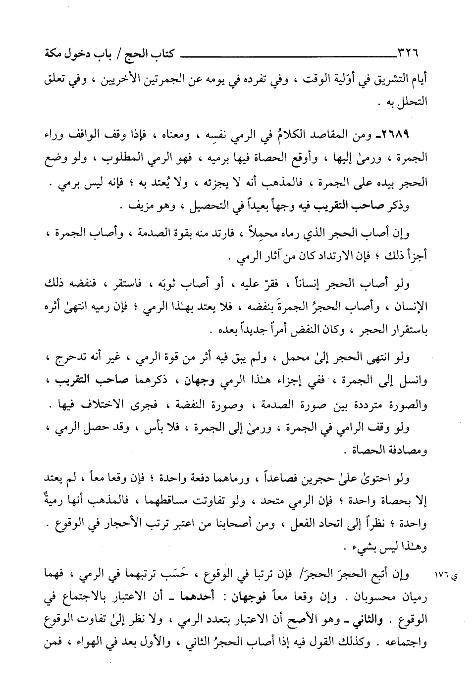 2689 - ومن المقاصد الكلامُ في الرمي نفسِه، ومعناه، فإذا وقف الواقف وراء الجمرة، ورمى إليها، وأوقع الحصاة فيها برميه، فهو الرمي المطلوب، ولو وضع الحجر بيده على الجمرة، فالمذهب أنه لا يجزئه، ولا يُعتد به؛ فإنه ليس برمي.