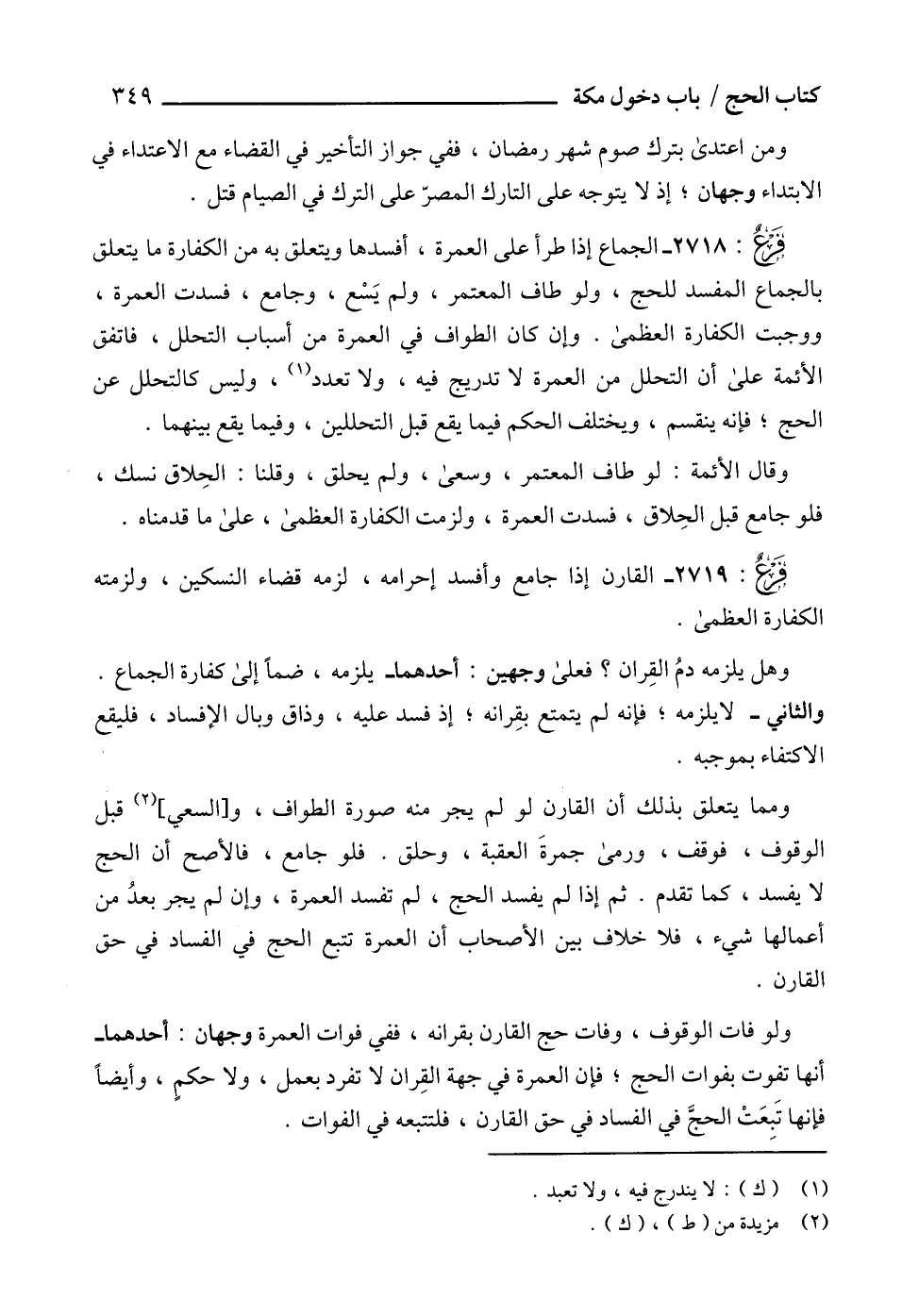 2719 - القارن إذا جامع وأفسد إحرامه، لزمه قضاء النسكين، ولزمته الكفارة العظمى.
