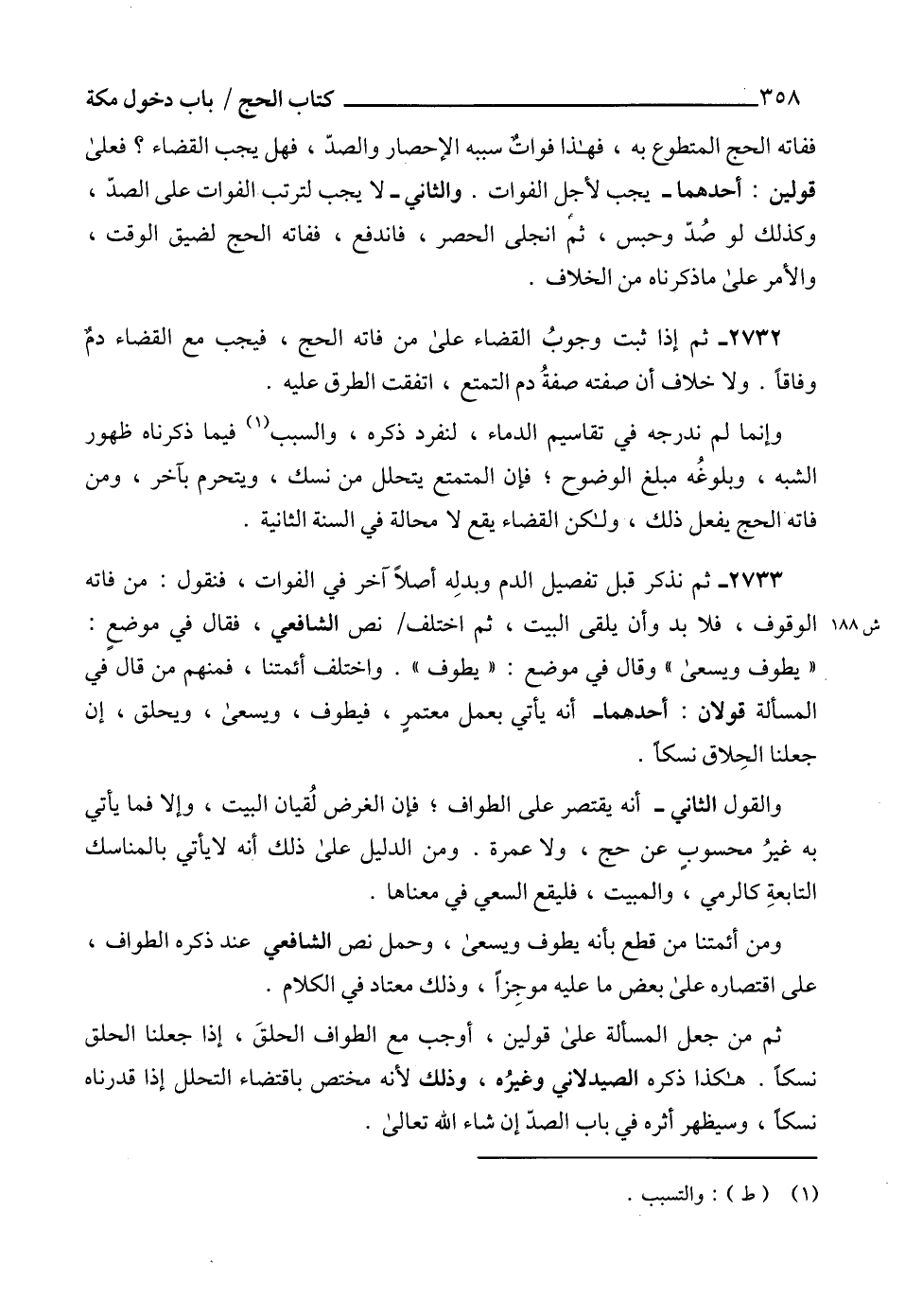 2733 - ثم نذكر قبل تفصيل الدم وبدلِه أصلاً آخر في الفوات، فنقول: من فاته الوقوف، فلا بد وأن يلقى البيت، ثم اختلف نص الشافعي، فقال في موضعٍ: " يطوف ويسعى " وقال في موضع: " يطوف ". واختلف أئمتنا، فمنهم من قال في المسألة قولان: أحدهما - أنه يأتي بعمل معتمرٍ، فيطوف، ويسعى، ويحلق، إن جعلنا الحِلاق نسكاً.