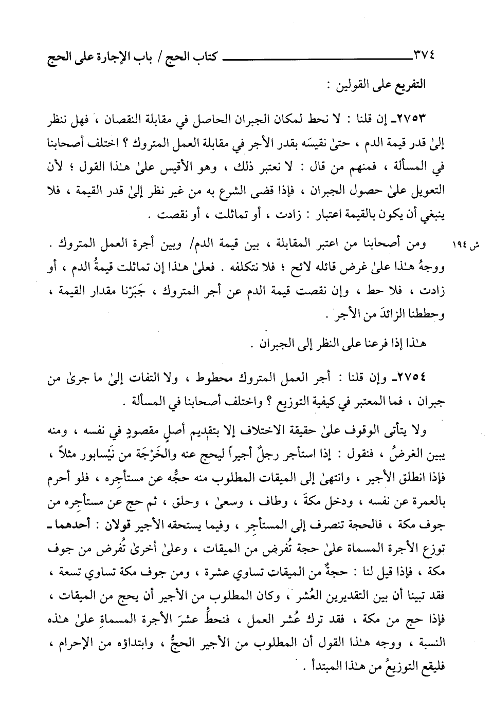 2753 - إن قلنا: لا نحط لمكان الجبران الحاصل في مقابلة النقصان، فهل ننظر إلى قدر قيمة الدم، حتى نقيسَه بقدر الأجر في مقابلة العمل المتروك؟ اختلف أصحابنا في المسألة، فمنهم من قال: لا نعتبر ذلك، وهو الأقيس على هذا القول؛ لأن التعويل على حصول الجبران، فإذا قضى الشرع به من غير نظر إلى قدر القيمة، فلا ينبغي أن يكون بالقيمة اعتبار: زادت، أو تماثلت، أو نقصت.