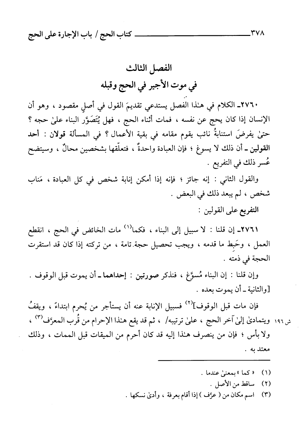 2760 - الكلام في هذا الفصل يستدعي تقديمَ القول في أصل مقصود، وهو أن الإنسان إذا كان يحج عن نفسه، فمات أثناء الحج، فهل يُتَصَوَّر البناء على حجه؟ حتى يفرضَ استنابةُ نائب يقوم مقامه في بقية الأعمال؟ في المسألة قولان: أحد القولين - أن ذلك لا يسوغ؛ فإن العبادة واحدةٌ، فتعلّقها بشخصين محالٌ، وسيتضح عُسر ذلك في التفريع.