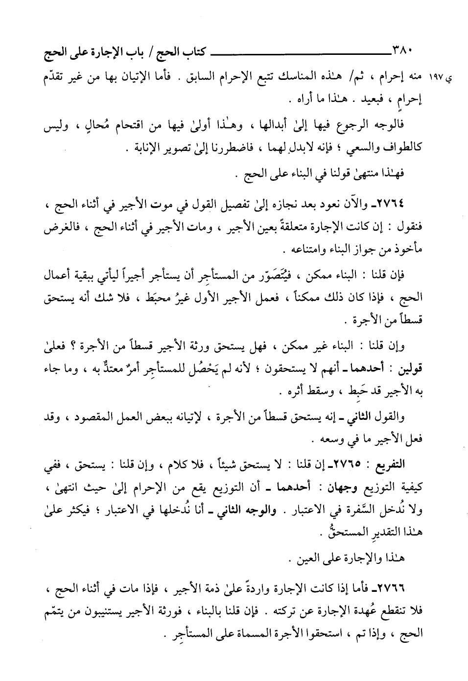 2764 - والآن نعود بعد نجازه إلى تفصيل القول في موت الأجير في أثناء الحج، فنقول: إن كانت الإجارة متعلقةً بعين الأجير، ومات الأجير في أثناء الحج، فالغرض مأخوذ من جواز البناء وامتناعه.