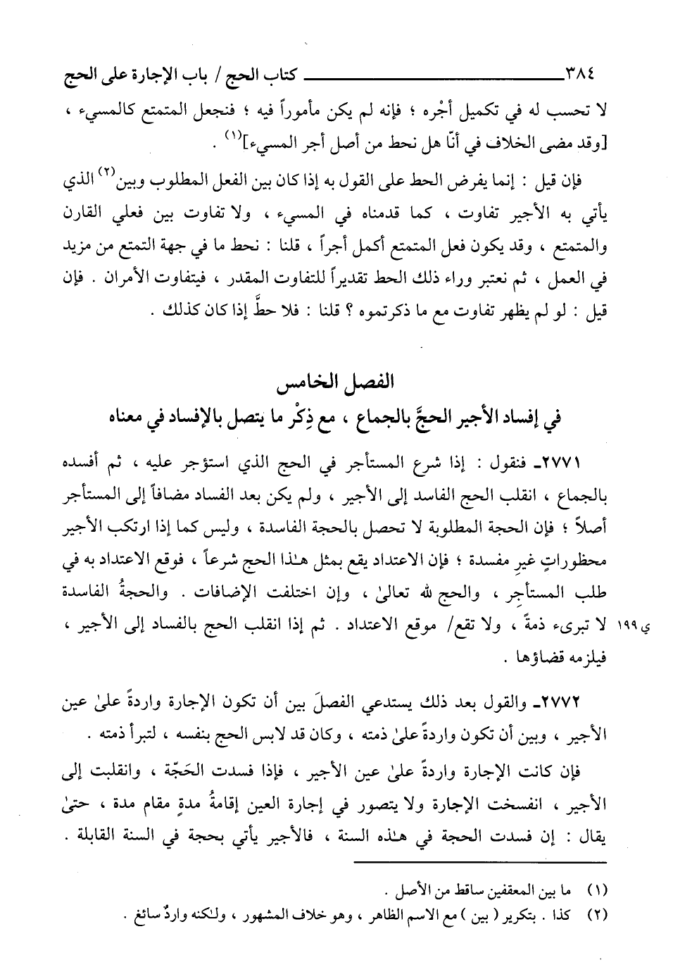 2771 - فنقول: إذا شرع المستأجر في الحج الذي استؤجر عليه، ثم أفسده بالجماع، انقلب الحج الفاسد إلى الأجير، ولم يكن بعد الفساد مضافاً إلى المستأجر أصلاً؛ فإن الحجة المطلوبة لا تحصل بالحجة الفاسدة، وليس كما إذا ارتكب الأجير محظوراتٍ غيرِ مفسدة؛ فإن الاعتداد يقع بمثل هذا الحج شرعاً، فوقع الاعتداد به في طلب المستأجِر، والحج لله تعالى، وإن اختلفت الإضافات. والحجةُ الفاسدة لا تبرئ ذمةً، ولا تقع موقع الاعتداد. ثم إذا انقلب الحج بالفساد إلى الأجير، فيلزمه قضاؤها.