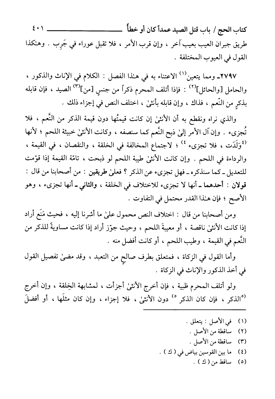 2797 - ومما يتعين (1) الاعتناء به في هذا الفصل: الكلام في الإناث والذكور، والحامل [والحائل] (2): فإذا أتلف المحرم ذكراً من جنسٍ [من] (3) الصيد، فإن قابله بذكبر من النّعم، فذاك، وإن قابله بأنثى، اختلف النص في إجزاء ذلك.