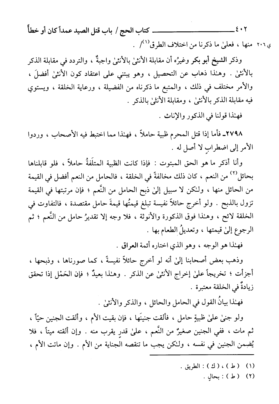 وأنا أذكر ما هو الحق المبتوت: فإذا كانت الظبية المتلَفةُ حاملاً، فلو قابلناها بحائل (2) من النعم، كان ذلك مخالفةً في الخلقة، فالحامل من النعم أفضل في القيمة من الحائل منها، ولكن لا سبيل إلى ذبح الحامل من النَّعم؛ فإن مرتبتها في القيمة تزول بالذبح. ولو أخرج حائلاً نفيسة تبلغ قيمتُها قيمةَ حامل مقتصدة، فالتفاوت في الخلقة لائح، وهذا فوق الذكورة والأنوثة، فلا وجه إلا تقديرُ حامل من النَّعم؛ ثم الرجوع إلى قيمتها، وتعديلُ الطعام بها.
