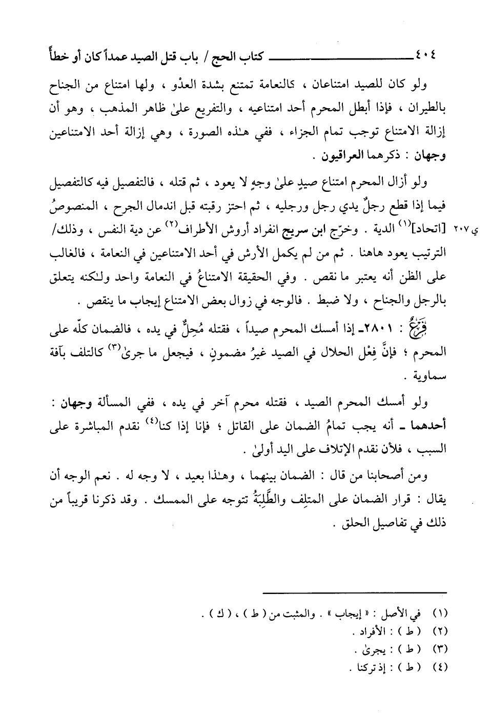 ولو أزال المحرم امتناع صيدٍ على وجهٍ لا يعود، ثم قتله، فالتفصيل فيه كالتفصيل فيما إذا قطع رجلٌ يدي رجل ورجليه، ثم احتز رقبته قبل اندمال الجرح، المنصوصُ [اتحاد] (1) الدية. وخرّج ابن سريج انفراد أروش الأطراف (2) عن دية النفس، وذلك الترتيب يعود هاهنا. ثم من لم يكمل الأرش في أحد الامتناعين في النعامة، فالغالب على الظن أنه يعتبر ما نقص. وفي الحقيقة الامتناعُ في النعامة واحد ولكنه يتعلق بالرجل والجناح، ولا ضبط. فالوجه في زوال بعض الامتناع إيجاب ما ينقص.