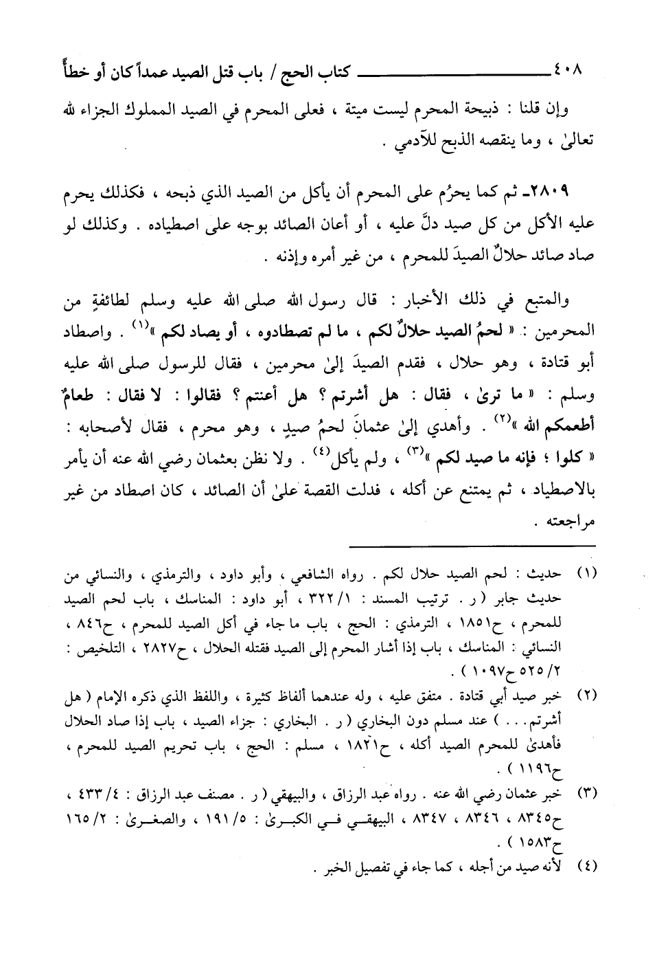 2809 - ثم كما يحرُم على المحرم أن يأكل من الصيد الذي ذبحه، فكذلك يحرم عليه الأكل من كل صيد دلَّ عليه، أو أعان الصائد بوجه على اصطياده. وكذلك لو صاد صائد حلالٌ الصيدَ للمحرم، من غير أمره وإذنه.