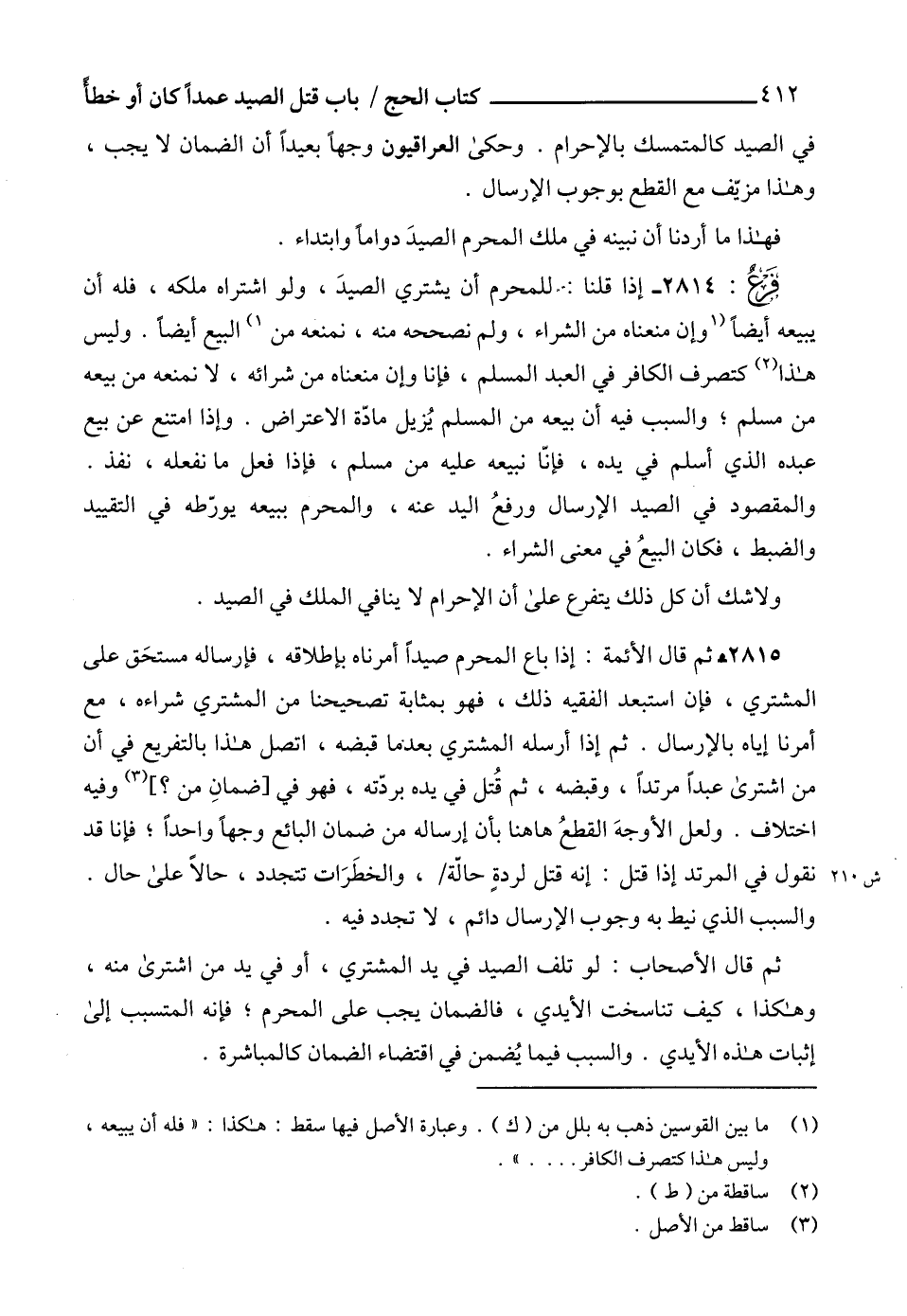2814 - إذا قلنا: للمحرم أن يشتري الصيدَ، ولو اشتراه ملكه، فله أن يبيعه أيضاًً (1 وإن منعناه من الشراء، ولم نصححه منه، نمنعه من 1) البيع أيضاً. وليس هذا (2) كتصرف الكافر في العبد المسلم، فإنا وإن منعناه من شرائه، لا نمنعه من بيعه من مسلم؛ والسبب فيه أن بيعه من المسلم يُزيل مادّة الاعتراض. وإذا امتنع عن بيع عبده الذي أسلم في يده، فإنّا نبيعه عليه من مسلم، فإذا فعل مانفعله، نفذ.