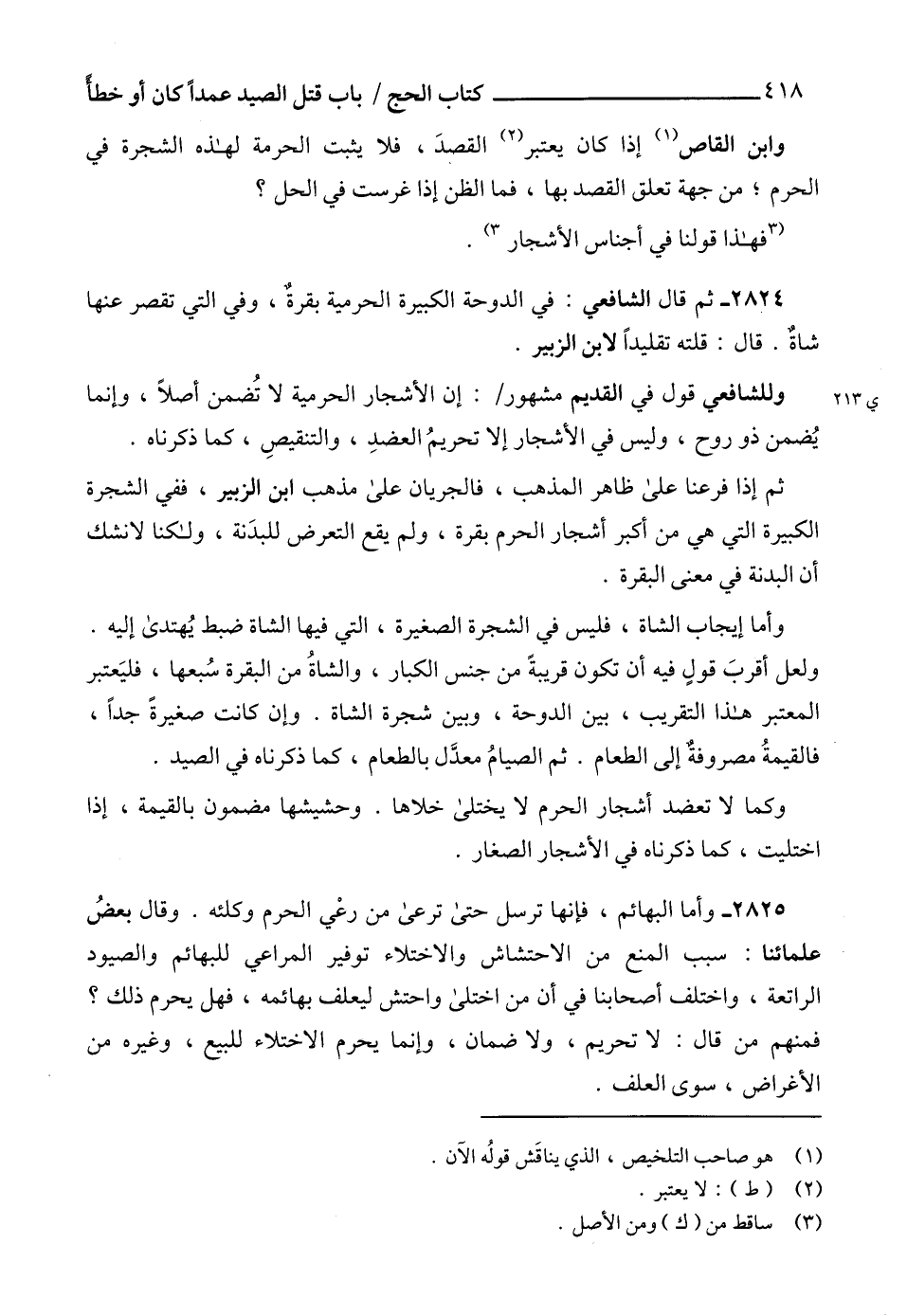 2824 - ثم قال الشافعي: في الدوحة الكبيرة الحرمية بقرةٌ، وفي التي تقصر عنها شاةٌ. قال: قلته تقليداً لابن الزبير.