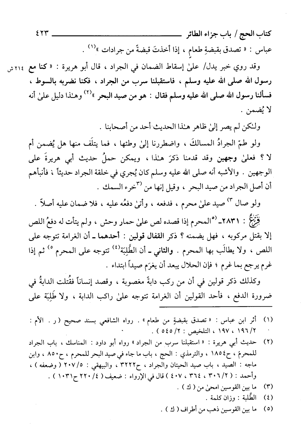 (2) حديث أبي هريرة: " استقبلنا سرب من الجراد " رواه أبو داود: المناسك، باب الجراد للمحرم، ح 1854، والترمذي: الحج، باب ما جاء في صيد البحر للمحرم، ح 850، وابن ماجه: الصيد، باب صيد الحيتان والجراد، ح 3222، والبيهقي: 5/ 207 (وضعفه)، وأحمد: (2/ 306، 364، 407) قال في الإرواء: ضعيف (4/ 220 ح 1031).