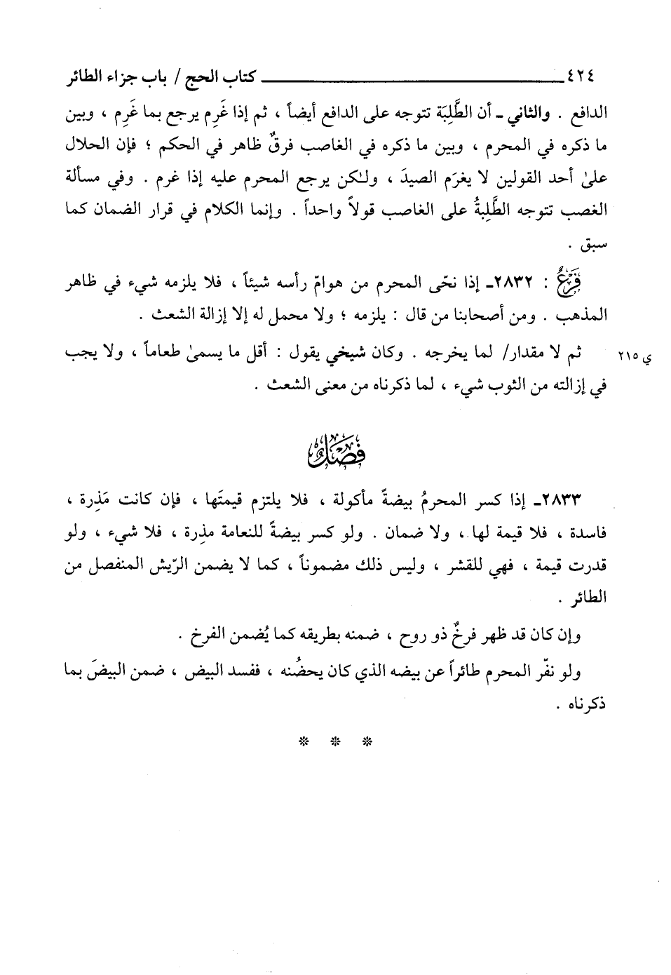 2833 - إذا كسر المحرمُ بيضةً مأكولة، فلا يلتزم قيمتَها، فإن كانت مَذِرة، فاسدة، فلا قيمة لها، ولا ضمان. ولو كسر بيضةً للنعامة مذِرة، فلا شيء، ولو قدرت قيمة، فهي لنقشر، وليس ذلك مضموناً، كما لا يضمن الرّيش المنفصل من الطائر.