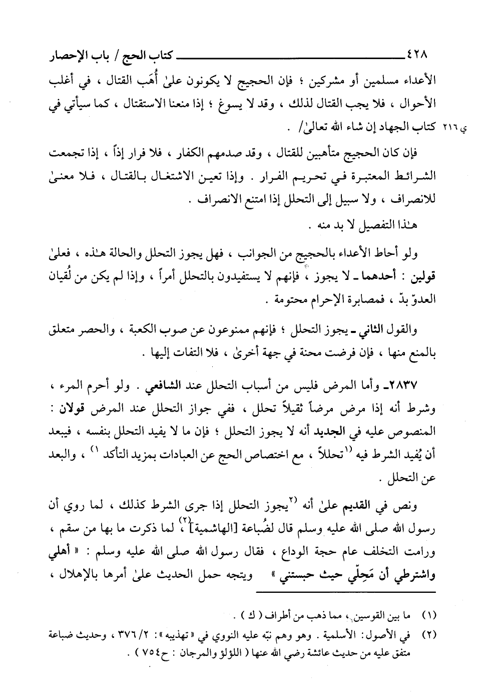 الأعداء مسلمين أو مشركين؛ فإن الحجيج لا يكونون على أُهَب القتال، في أغلب الأحوال، فلا يجب القتال لذلك، وقد لا يسوغ؛ إذا منعنا الاستقتال، كما سيأتي في كتاب الجهاد إن شاء الله تعالى.