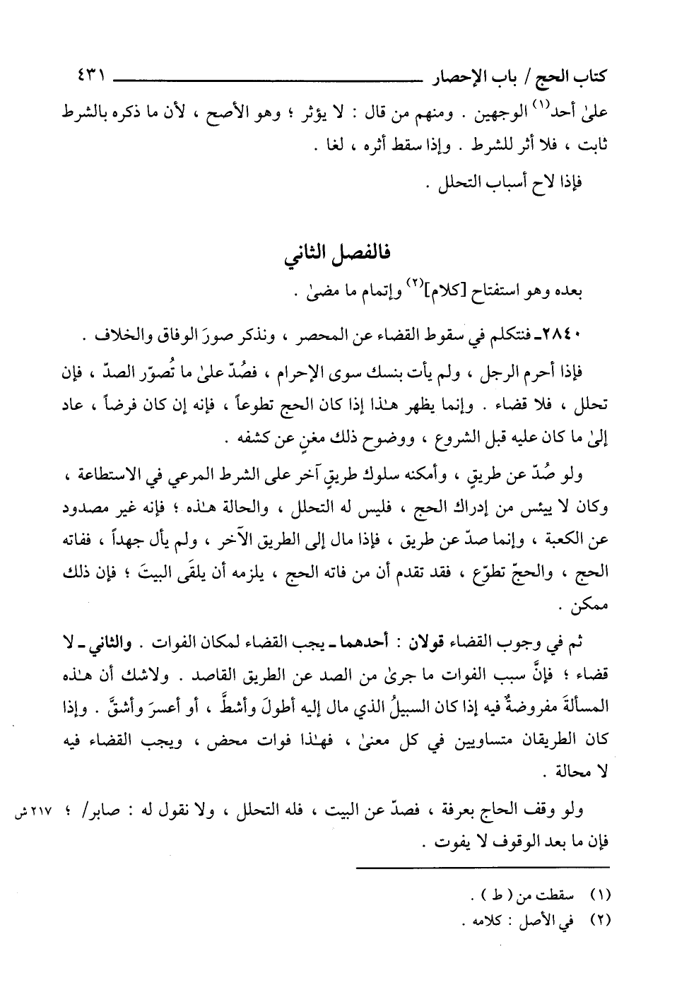 2840 - فنتكلم في سقوط القضاء عن المحصر، ونذكر صورَ الوفاق والخلاف.