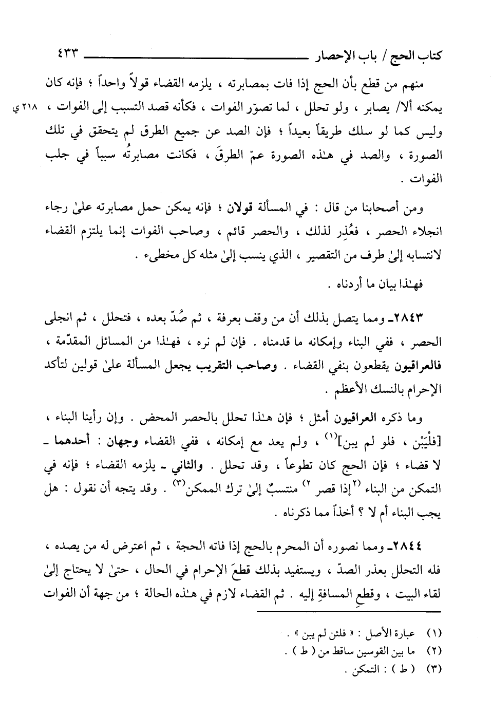 2844 - ومما نصوره أن المحرم بالحج إذا فاته الحجة، ثم اعترض له من يصده، فله التحلل بعذر الصدّ، ويستفيد بذلك قطعَ الإحرام في الحال، حتى لا يحتاج إلى لقاء البيت، وقطعِ المسافةِ إليه. ثم القضاء لازم في هذه الحالة؛ من جهة أن الفوات