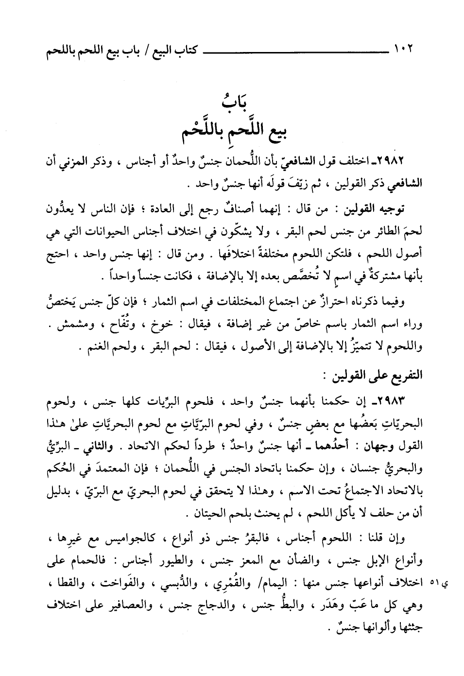 2982 - اختلف قول الشافعيّ بأن اللُّحمان جنسٌ واحدٌ أو أجناس، وذكر المزني أن الشافعي ذكر القولين، ثم زيّفَ قولَه أنها جنسٌ واحد.