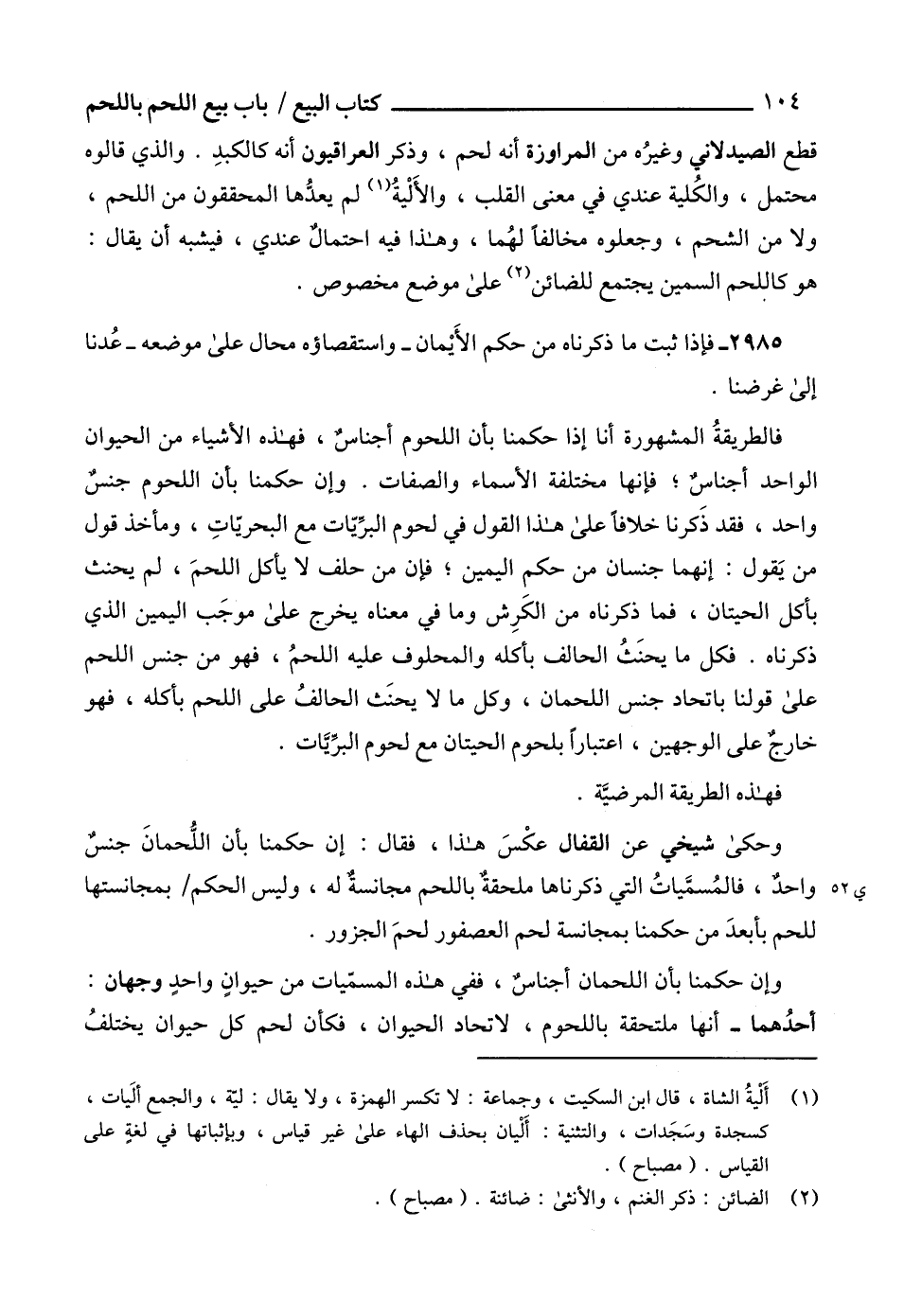 قطع الصيدلاني وغيرُه من المراوزة أنه لحم، وذكر العراقيون أنه كالكبدِ. والذي قالوه محتمل، والكُلية عندي في معنى القلب، والأَلْيةُ (1) لم يعدُّها المحققون من اللحم، ولا من الشحم، وجعلوه مخالفاًً لهُما، وهذا فيه احتمالٌ عندي، فيشبه أن يقال: هو كاللحم السمين يجتمع للضائن (2) على موضع مخصوص.