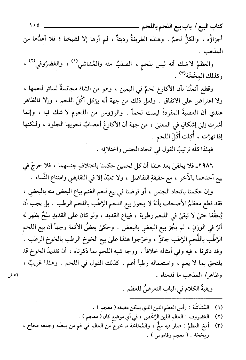 2986 - فلا يخفى بعد هذا أن كل لحمين حكمنا باختلافِ جنسهما، فلا حرجَ في بيع أحدهما بالآخر، مع حقيقةِ التفاضل، ولا تعبّدَ إلا في التقابضِ وامتناع النَّساء.