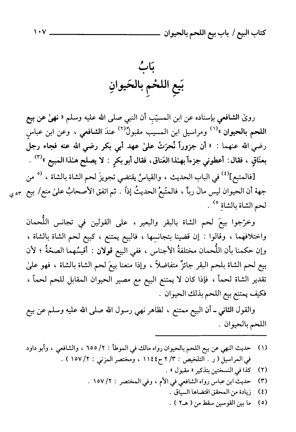 (1) حديث النهي عن بيع اللحم بالحيوان رواه مالك في الموطأ: 2/ 655، والشافعي، وأبو داود في المراسيل (ر. التلخيص: 3/ 2 ح 1144، ومختصر المزني: 2/ 157).