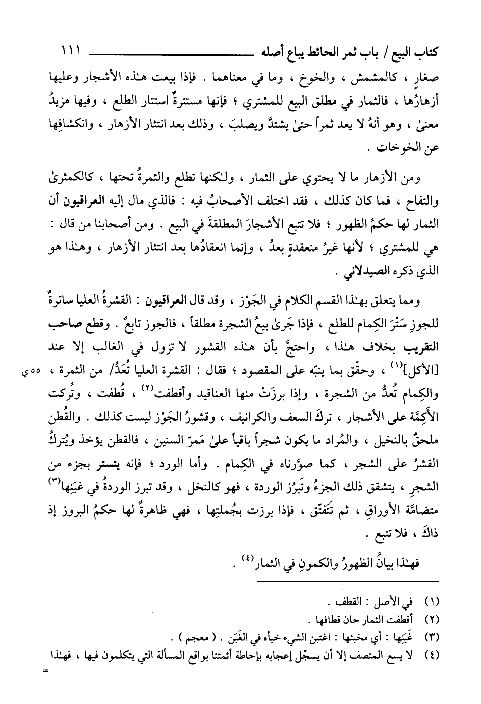 صغار، كالمشمش، والخوخ، وما في معناهما. فإذا بيعت هذه الأشجار وعليها أزهارُها، فالثمار في مطلق البيع للمشتري؛ فإنها مستترةٌ استتار الطلع، وفيها مزيدُ معنى، وهو أنهُ لا يعد ثمراً حتى يشتدَّ ويصلبَ، وذلك بعد انتثار الأزهار، وانكشافِها عن الخوخات.