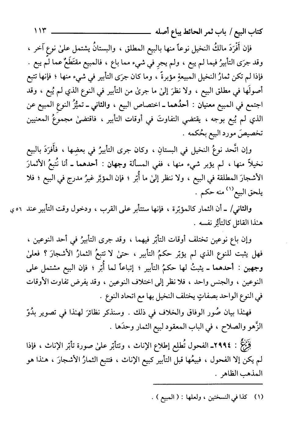 فإذا لم تكن ثمارُ النخيل المبيعةِ مؤبرة، وما كان جرَى التأبير في شيء منها؛ فإنها تتبع أصولَها في مطلق البيع، ولا نظرَ إلى ما جرى من التأبير في النوع الذي لم يُبع، وقد اجتمع في المبيع معنيان: أحدُهما - اختصاص البيع، والثاني - تميُّزُ النوعِ المبيع عن الذي لم يُبع بوجه، يقتضي التفاوتَ في أوقات التأبير، فاقتضى مجموعُ المعنيين تخصيصَ مورد البيع بحُكمه.