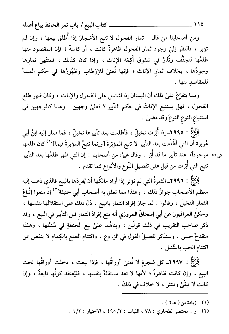 2997 - كل شجرةٍ لا تُعنى أوراقُها، فإذا بيعت، دخلت أوراقُها تحت البيع، وإن كانت ظاهرةً؛ لأنها لا تعد مستقلةً بنفسها، فليُعتقد كونُها تابعةً، وإن كانت لا تبقَى وتنتثر، لا خلاف في ذلكَ.