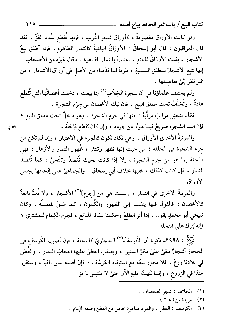 2998 - ذكرنا أن الكُرسفَ (3) الحجازيّ كالنخلة، فإن أصول الكُرسفِ في الحجاز أشجارٌ تبقى على مكرِّ السنين، ويعتقب القطنُ عليها اعتقابَ الثمار، والقُطن في بلادنا زرعٌ، فلا يجوز بيعُه مع استبقاء الكرسُف؛ فإن أصله ليس باقياً، وسنقرر هذا في الزروعِ، وإنما نبَّهتُ عليهِ الآن حتى لا يلتبس ناجزاً.