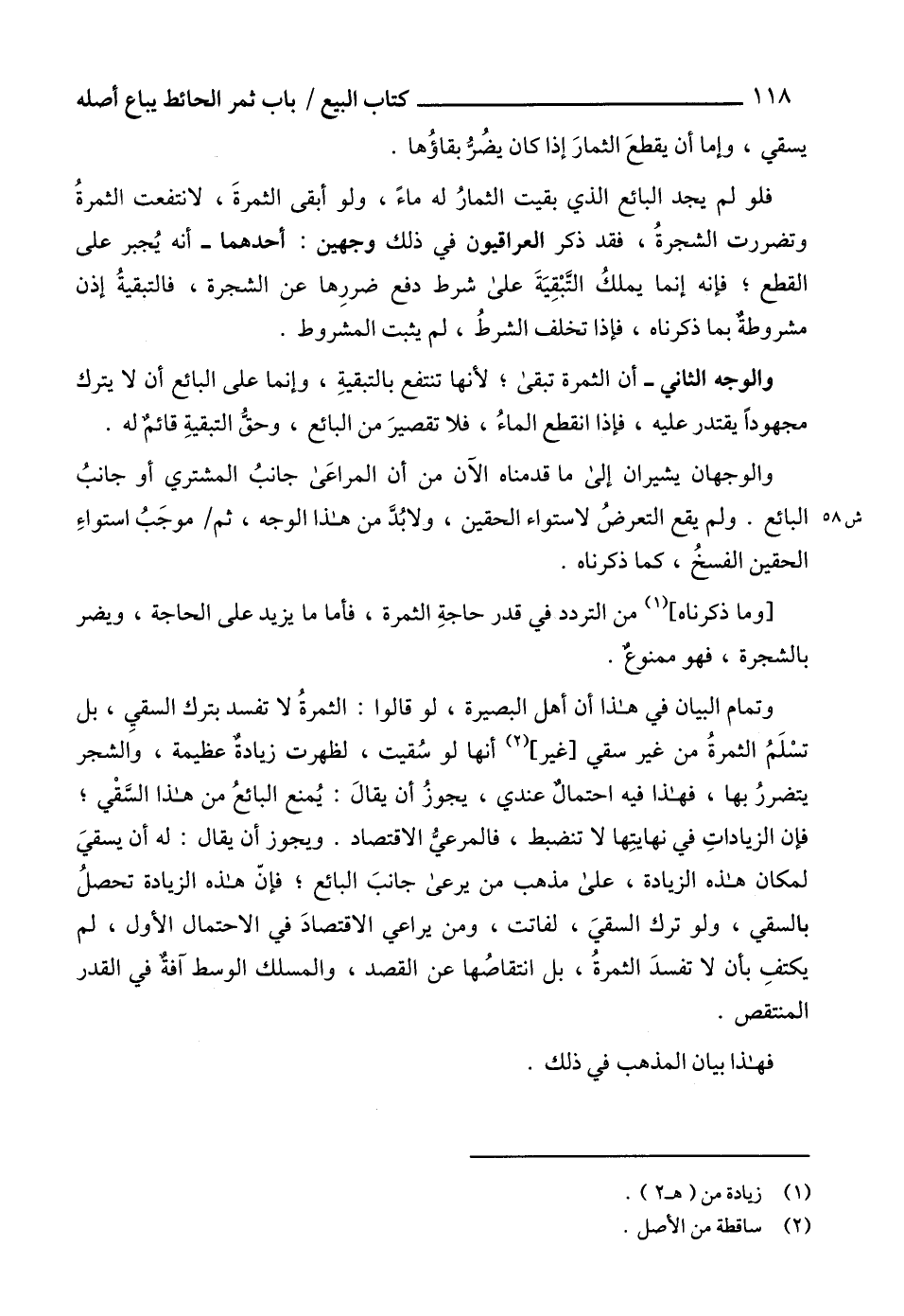 وتمام البيان في هذا أن أهل البصيرة، لو قالوا: الثمرةُ لا تفسد بترك السقيِ، بل تسْلَمُ الثمرةُ من غير سقي [غير] (2) أنها لو سُقيت، لظهرت زيادة عظيمة، والشجر يتضررُ بها، فهذا فيه احتمالٌ عندي، يجوزُ أن يقالَ: يُمنع البائعُ من هذا السَّقْي؛ فإن الزياداتِ في نهايتِها لا تنضبط، فالمرعيُّ الاقتصاد. ويجوز أن يقال: له أن يسقيَ لمكان هذه الزيادة، على مذهب من يرعى جانبَ البائع؛ فإنّ هذه الزيادة تحصلُ بالسقي، ولو ترك السقيَ، لفاتت، ومن يراعي الاقتصادَ في الاحتمال الأول، لم يكتفِ بأن لا تفسدَ الثمرةُ، بل انتقاصُها عن القصد، والمسلك الوسط آفةٌ في القدر المنتقص.