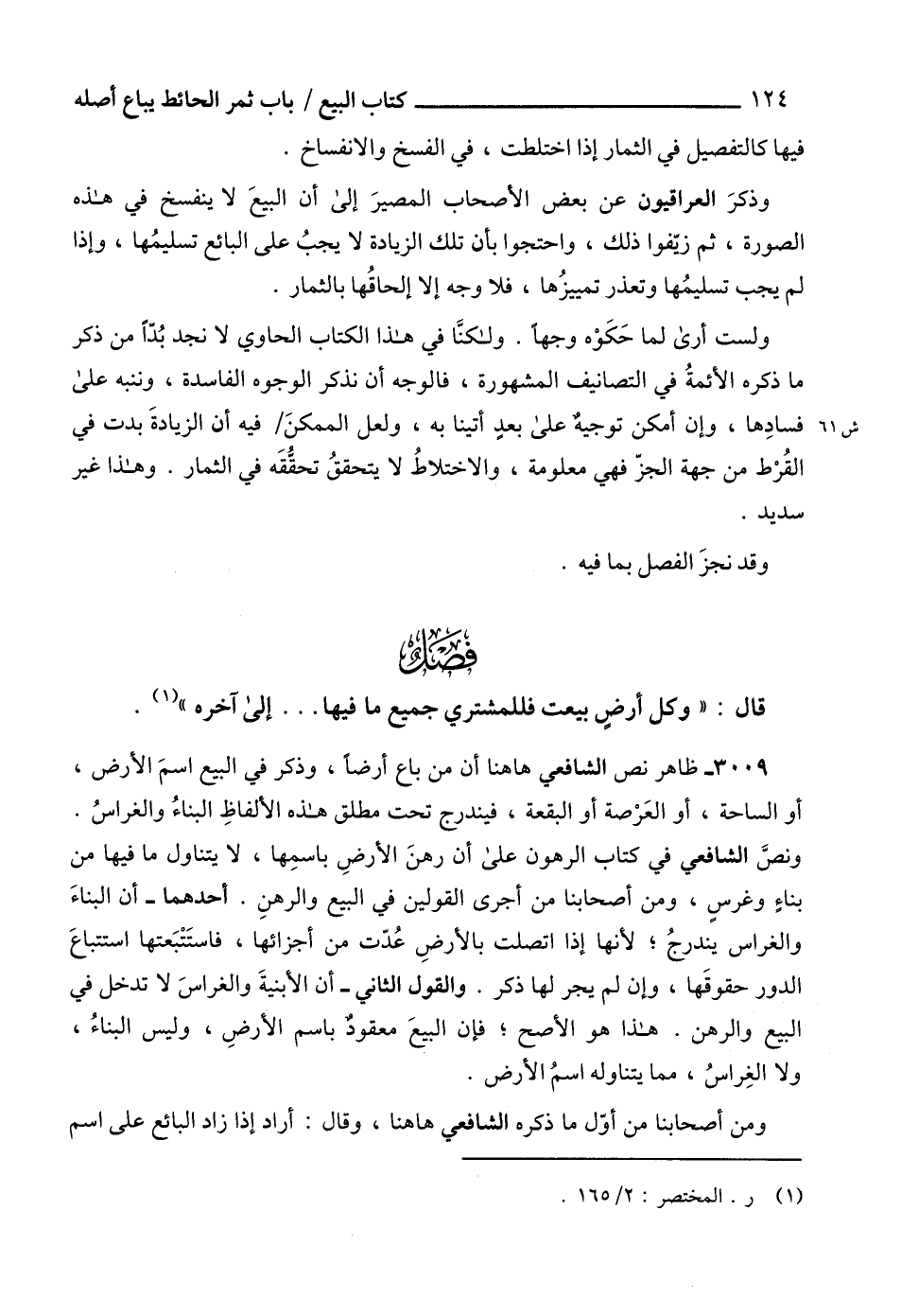 3009 - ظاهر نص الشافعي هاهنا أن من باع أرضاً، وذكر في البيع اسمَ الأرض، أو الساحة، أو العَرْصة أو البقعة، فيندرج تحت مطلق هذه الألفاظِ البناء والغراس.