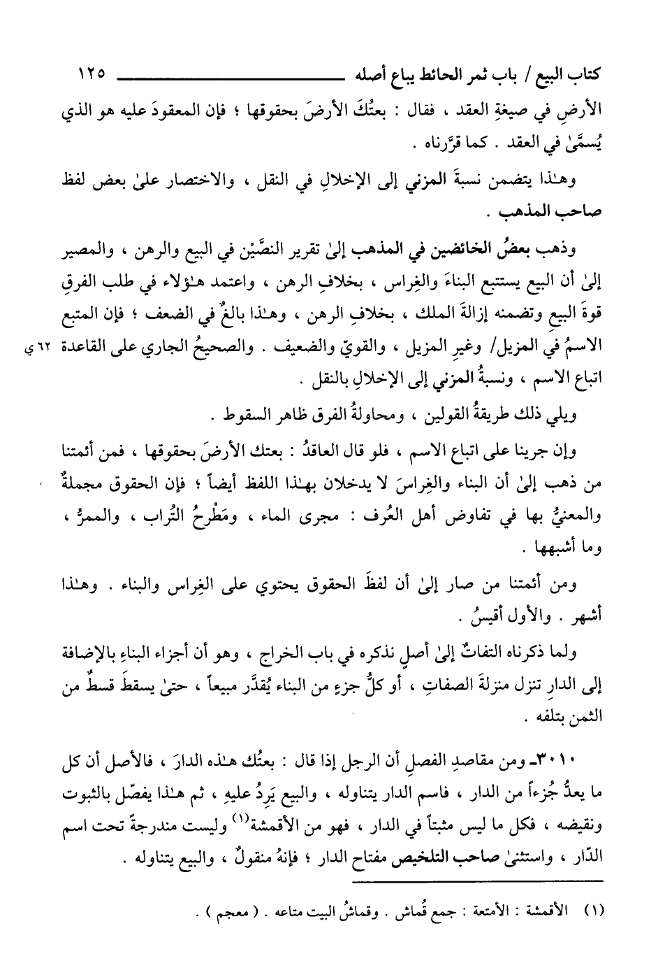 3010 - ومن مقاصدِ الفصلِ أن الرجل إذا قال: بعتُك هذه الدارَ، فالأصل أن كل ما يعدُّ جُزءاً من الدار، فاسم الدار يتناوله، والبيع يَرِدُ عليهِ، ثم هذا يفصّل بالثبوت ونقيضه، فكل ما ليس مثبتاً في الدار، فهو من الأقمشة (1) وليست مندرجة تحت اسم الدّار، واستثنى صاحب التلخيص مفتاح الدار؛ فإنهُ منقولٌ، والبيع يتناوله.