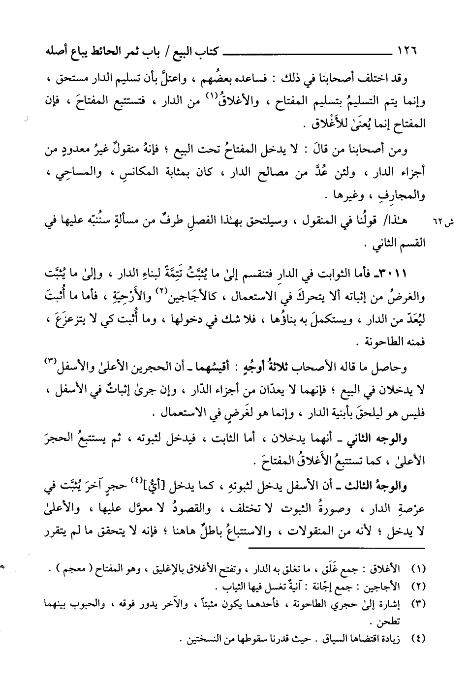 3011 - فأما الثوابت في الدارِ فتنقسم إلى ما يثبَّتُ تَتِمَّةً لبناءِ الدار، وإلى ما يَثبَّت والغرضُ من إثباته ألا يتحركَ في الاستعمال، كالأجَاجين (2) والأَرْحِيَةِ، فأما ما أُثبتَ ليُعَدّ من الدار، ويستكملَ به بناؤُها، فلا شك في دخولها، وما أُثبت كي لا يتزعزَعَ، فمنه الطاحونة.