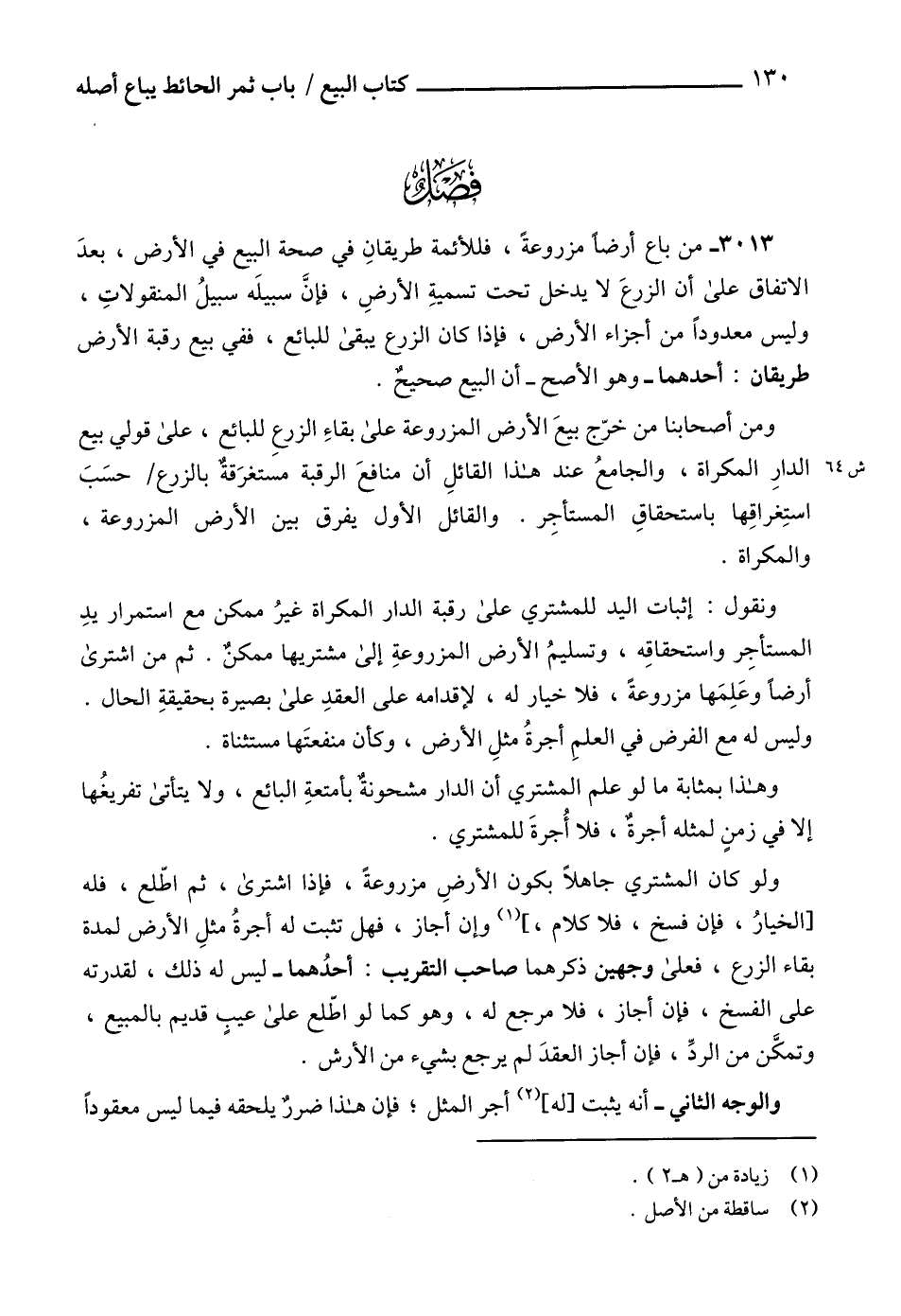 3013 - من باع أرضاً مزروعةً، فللأئمة طريقانِ في صحة البيع في الأرض، بعدَ الاتفاق على أن الزرعَ لا يدخل تحت تسميةِ الأرضِ، فإنّ سبيلَه سبيلُ المنقولاتِ، وليس معدوداً من أجزاء الأرض، فإذا كان الزرع يبقى للبائع، ففي بيع رقبة الأرض طريقان: أحدهما -وهو الأصح- أن البيع صحيحٌ.