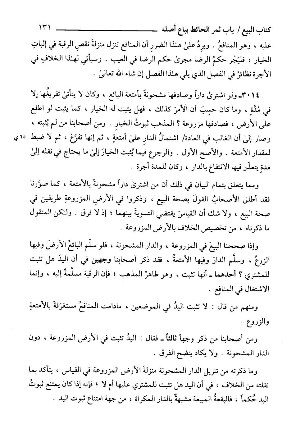 3014 - ولو اشترى داراً وصادفها مشحونةً بأمتعة البائع، وكان لا يتأتى تفريغُها إلا في مُدَّةٍ، وما كان حسِبَ أن الأمرَ كذلك، فهل يثبت له الخيار، كما يثبت لو اطلع على الأرض، فصادفها مزروعة؟ المذهب ثبوتُ الخيارِ. ومن أصحابنا من لم يُثبتة، وصار إلى أن الغالب في العادة اشتمالُ الدارِ على أمتعةٍ، ثم إنها تفرَّغ، ثم لا ضبط لمقدار الأمتعة. والأصح الأول. والرجوع فيما يُثبت الخيارَ إلى ما يحتاج في نقله إلى مدةٍ يتعذّر فيها الانتفاع بالدار، وكان للمدة أجرة.