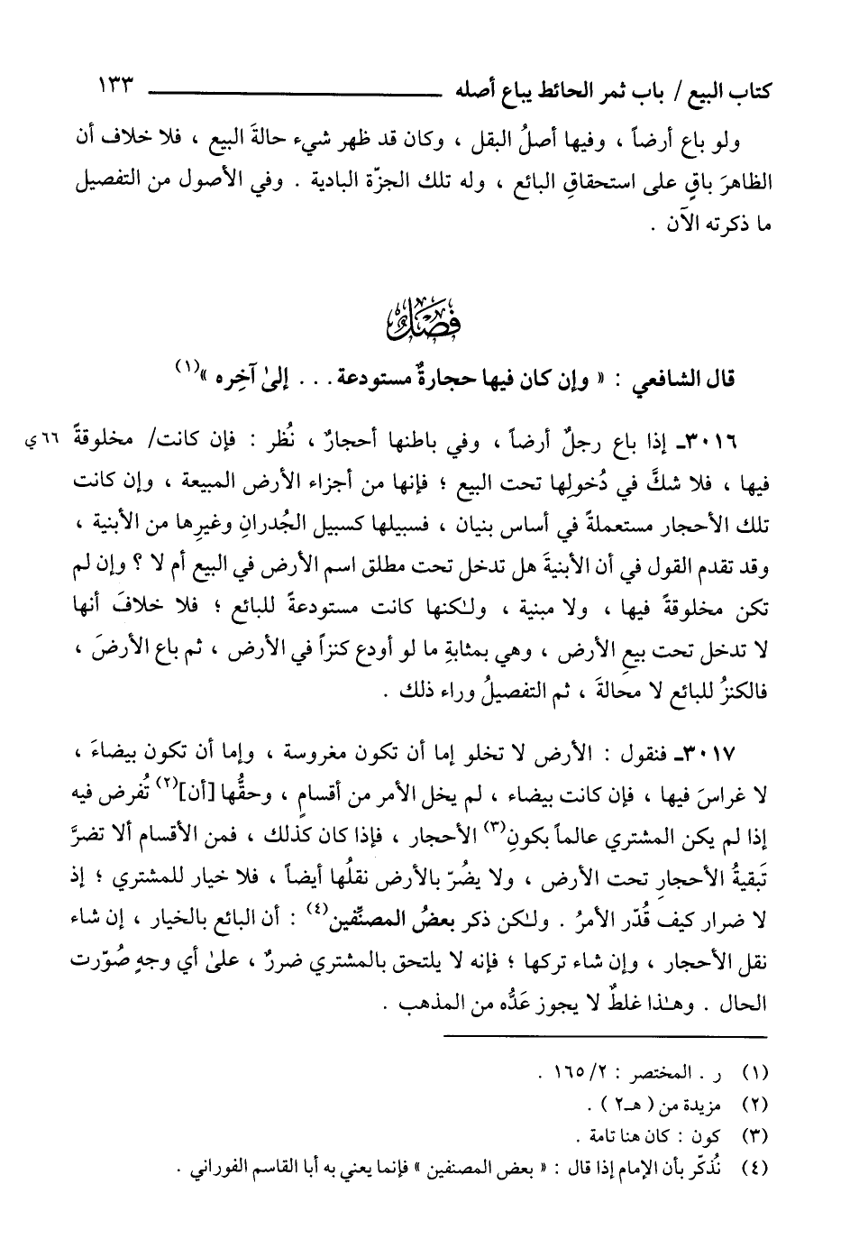 3016 - إذا باع رجلٌ أرضاً، وفي باطنها أحجارٌ، نُظر: فإن كانت مخلوقةً فيها، فلا شكَّ في دُخولها تحت البيع؛ فإنها من أجزاء الأرض المبيعة، وإن كانت تلك الأحجار مستعملةً في أساس بنيان، فسبيلها كسبيل الجُدرانِ وغيرِها من الأبنية، وقد تقدم القول في أن الأبنيةَ هل تدخل تحت مطلق اسم الأرض في البيع أم لا؟ وإن لم تكن مخلوقةً فيها، ولا مبنية، ولكنها كانت مستودعةً للبائع؛ فلا خلافَ أنها لا تدخل تحت بيعِ الأرض، وهي بمثابةِ ما لو أودع كنزاً في الأرض، ثم باع الأرضَ، فالكنزُ للبائع لا محالةَ، ثم التفصيلُ وراء ذلك.