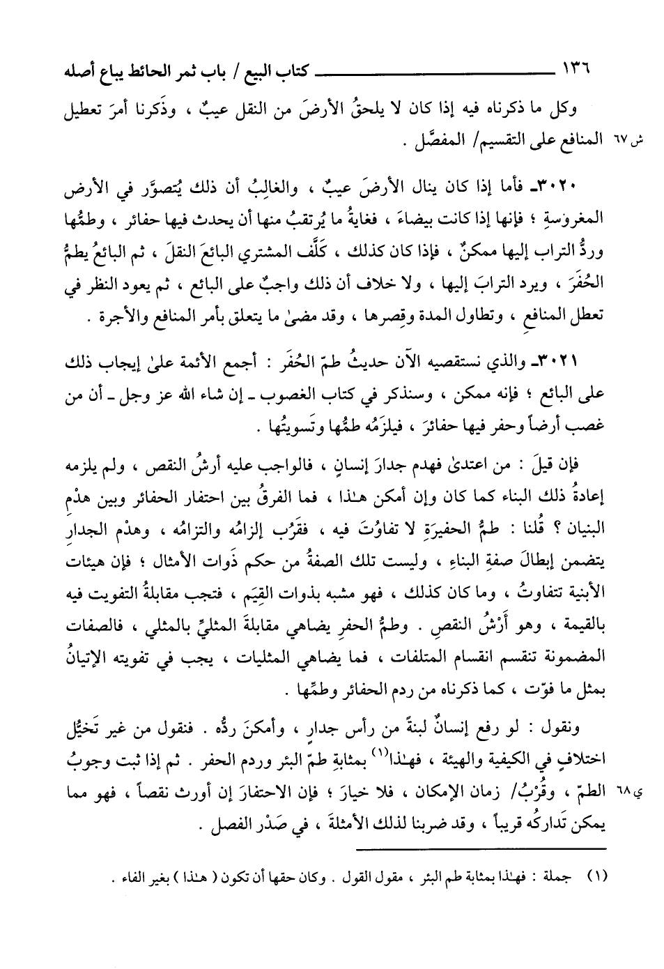 3021 - والذي نستقصيه الآن حديثُ طمّ الحُفَر: أجمع الأئمة على إيجاب ذلك على البائع؛ فإنه ممكن، وسنذكر في كتاب الغصوب -إن شاء الله عز وجل- أن من غصب أرضاً وحفر فيها حفائرَ، فيلزَمُه طمُّها وتَسويتُها.