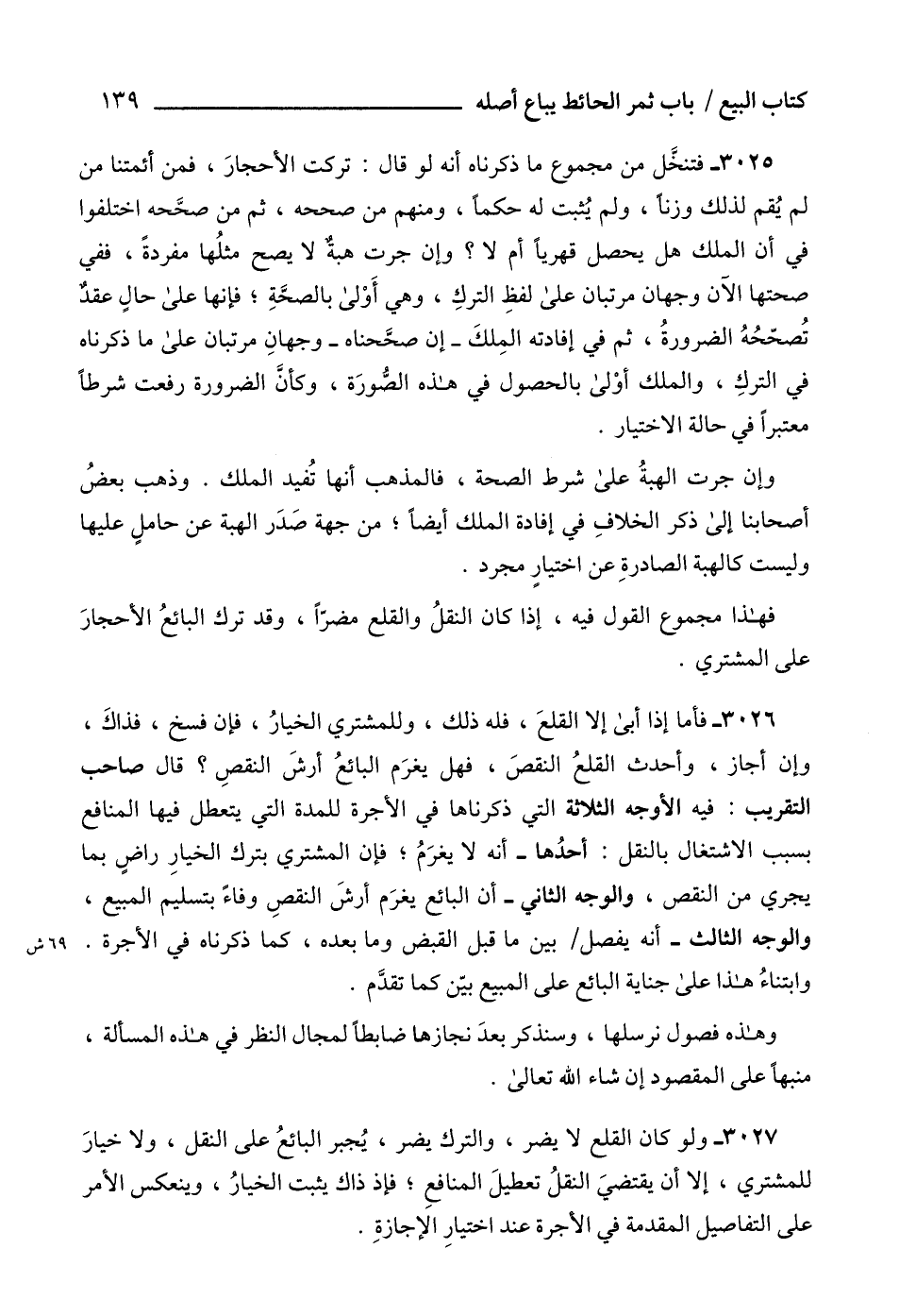 3027 - ولو كان القلع لا يضر، والترك يضر، يُجبر البائعُ على النقل، ولا خيارَ للمشتري، إلا أن يقتضيَ النقلُ تعطيلَ المنافعِ؛ فإذ ذاك يثبت الخيارُ، وينعكس الأمر على التفاصيل المقدمة في الأجرة عند اختيارِ الإجازةِ.