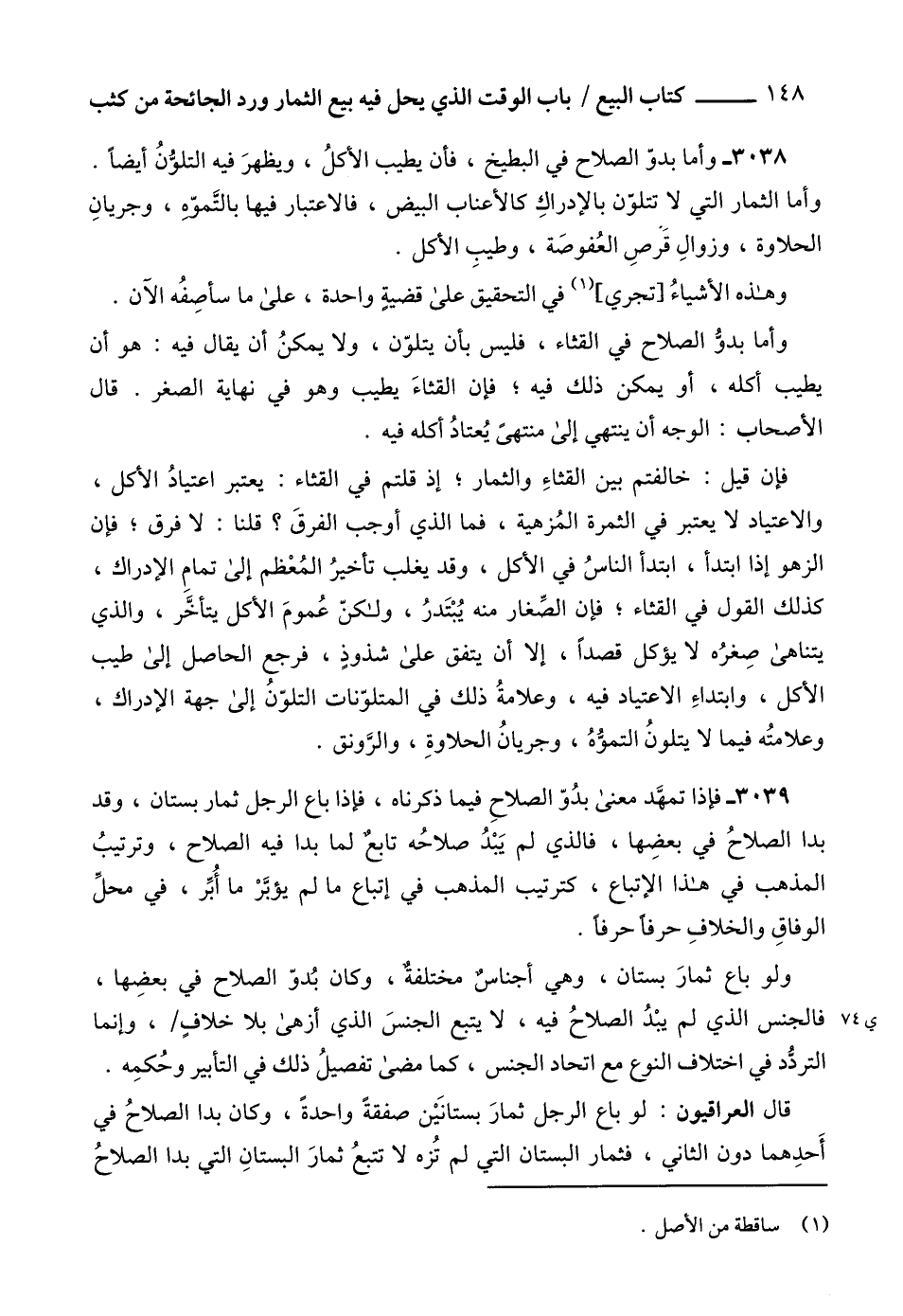 قال العراقيون: لو باع الرجل ثمارَ بستانَيْن صفقةً واحدةً، وكان بدا الصلاحُ في أَحدِهما دون الثاني، فثمار البستان التي لم تُزه لا تتبعُ ثمارَ البستانِ التي بدا الصلاحُ