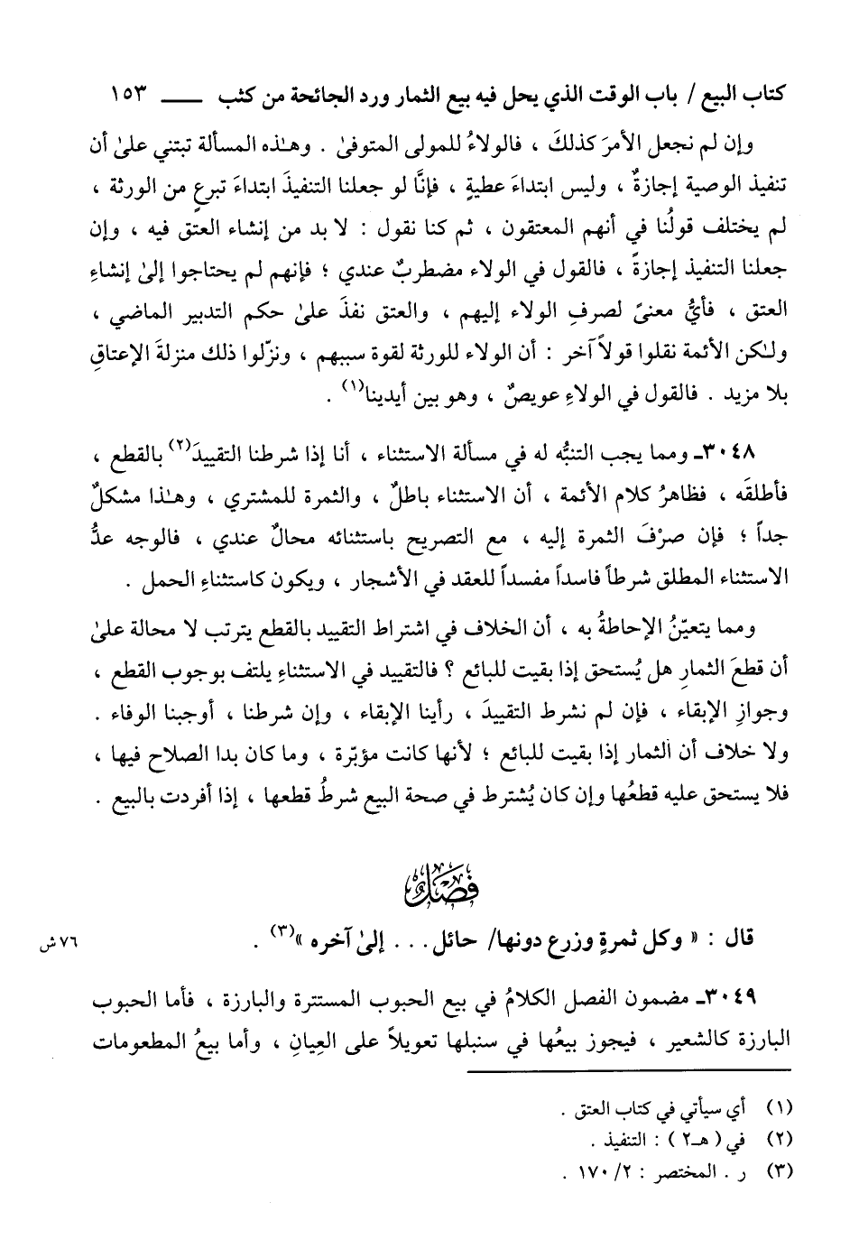 3048 - ومما يجب التنبُّه له في مسألة الاستثناء، أنا إذا شرطنا التقييدَ (2) بالقطع، فأطلقَه، فظاهرُ كلام الأئمة، أن الاستثناء باطلٌ، والثمرة للمشتري، وهذا مشكلٌ جداً؛ فإن صرْفَ الثمرة إليه، مع التصريح باستثنائه محالٌ عندي، فالوجه عدُّ الاستثناء المطلق شرطاً فاسداً مفسداً للعقد في الأشجار، ويكون كاستثناءِ الحمل.