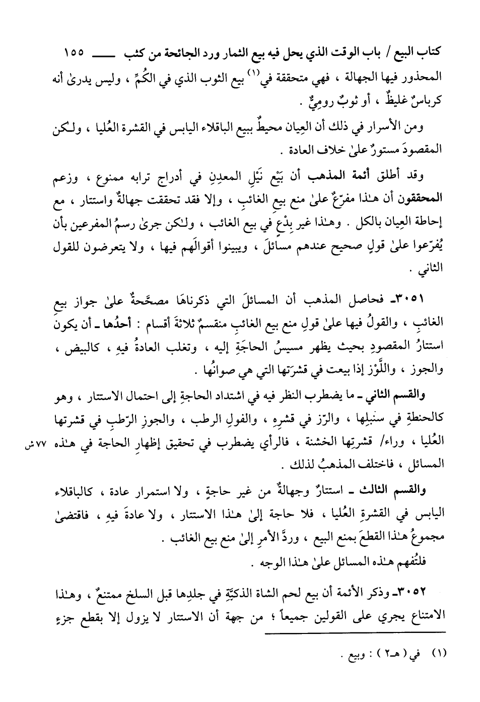 3051 - فحاصل المذهب أن المسائلَ التي ذكرناهَا مصحَّحةٌ على جواز بيعِ الغائبِ، والقولُ فيها على قولِ منع بيع الغائبِ منقسمٌ ثلاثةَ أقسام: أحدُها - أن يكون استتارُ المقصودِ بحيث يظهر مسيسُ الحاجَةِ إليه، وتغلب العادةُ فيهِ، كالبيض، والجوز، واللَّوْز إذا بيعت في قشرَتها التي هي صوانُها.
