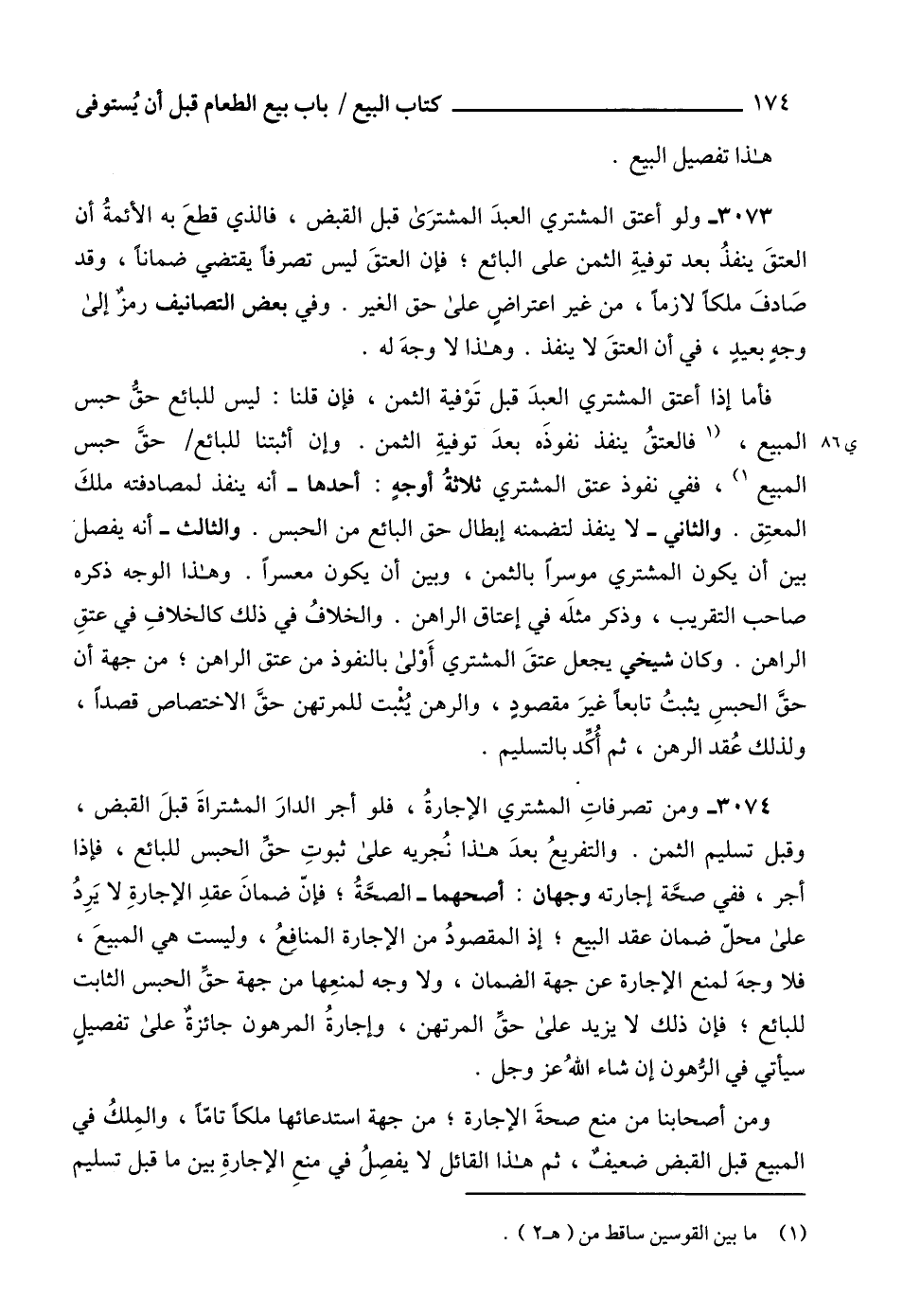 3073 - ولو أعتق المشتري العبدَ المشترَى قبل القبض، فالذي قطعَ به الأئمةُ أن العتقَ ينفذُ بعد توفيةِ الثمن على البائع؛ فإن العتقَ ليس تصرفاً يقتضي ضماناً، وقد صَادفَ ملكاً لازماً، من غير اعتراضٍ على حق الغير. وفي بعض التصانيف رمزٌ إلى وجهٍ بعيدٍ، في أن العتقَ لا ينفذ. وهذا لا وجهَ له.
