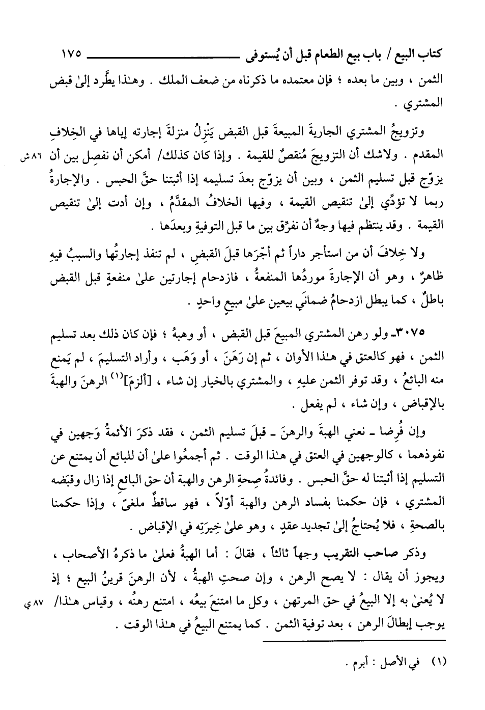 3075 - ولو رهن المشتري المبيعَ قبل القبض، أو وهبهُ؛ فإن كان ذلك بعد تسليم الثمن، فهو كالعتق في هذا الأوان، ثم إن رَهَنَ، أو وَهَب، وأراد التسليمَ، لم يَمنع منه البائعُ، وقد توفر الثمن عليهِ، والمشتري بالخيار إن شاء، [ألزمَ] (1) الرهنَ والهبةَ بالإقباض، وإن شاء، لم يفعل.
