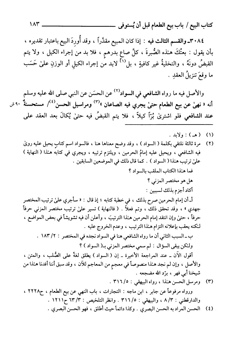 (2) مرة ثالثة نلتقي بكلمة (السواد)، وقد وضح معناها هنا، فالسواد اسم كتابِ يحيل عليه روى فيه الشافعي، ويحيل عليه إمامُ الحرمين، ويلتزم ترتيبه، ويجري في كتابه هذا (النهاية) على ترتيب هذا (السواد). كما قال ذلك في الموضعين السابقين.