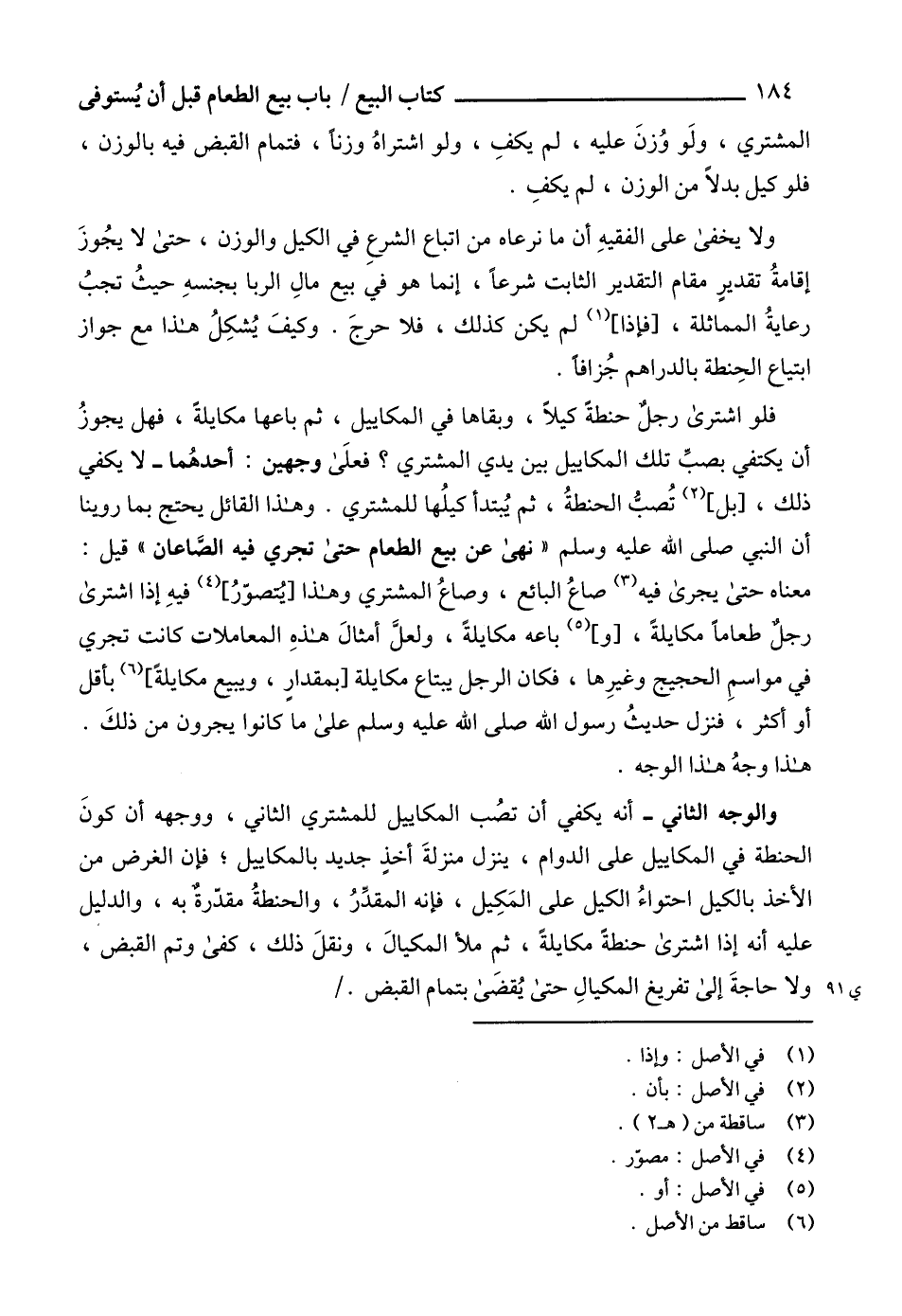 فلو اشترى رجلٌ حنطةً كيلاً، وبقاها في المكاييل، ثم باعها مكايلةً، فهل يجوزُ أن يكتفي بصبِّ تلك المكاييل بين يدي المشتري؟ فعلَى وجهين: أحدهُما - لا يكفي ذلك، [بل] (2) تُصبُّ الحنطةُ، ثم يُبتدأ كيلُها للمشتري. وهذا القائل يحتج بما روينا أن النبي صلى الله عليه وسلم " نهى عن بيع الطعام حتى تجري فيه الصَّاعان " قيل: معناه حتى يجرى فيه (3) صاعُ البائع، وصاعُ المشتري وهذا [يُتصوّرُ] (4) فيهِ إذا اشترى رجلٌ طعاماً مكايلةً، [و] (5) باعه مكايلةً، ولعلَّ أمثالَ هذهِ المعاملات كانت تجري في مواسمِ الحجيج وغيرِها، فكان الرجل يبتاع مكايلة [بمقدارٍ، ويبيع مكايلةً] (6) بأقل أو أكثر، فنزل حديثُ رسول الله صلى الله عليه وسلم على ما كانوا يجرون من ذلكَ.