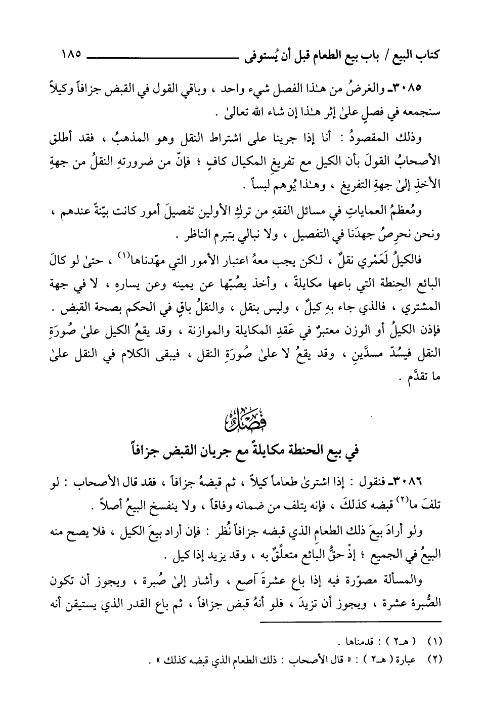 3085 - والغرضُ من هذا الفصل شيء واحد، وباقي القول في القبض جزافاً وكيلاً سنجمعه في فصلٍ على إثر هذا إن شاء الله تعالى.
