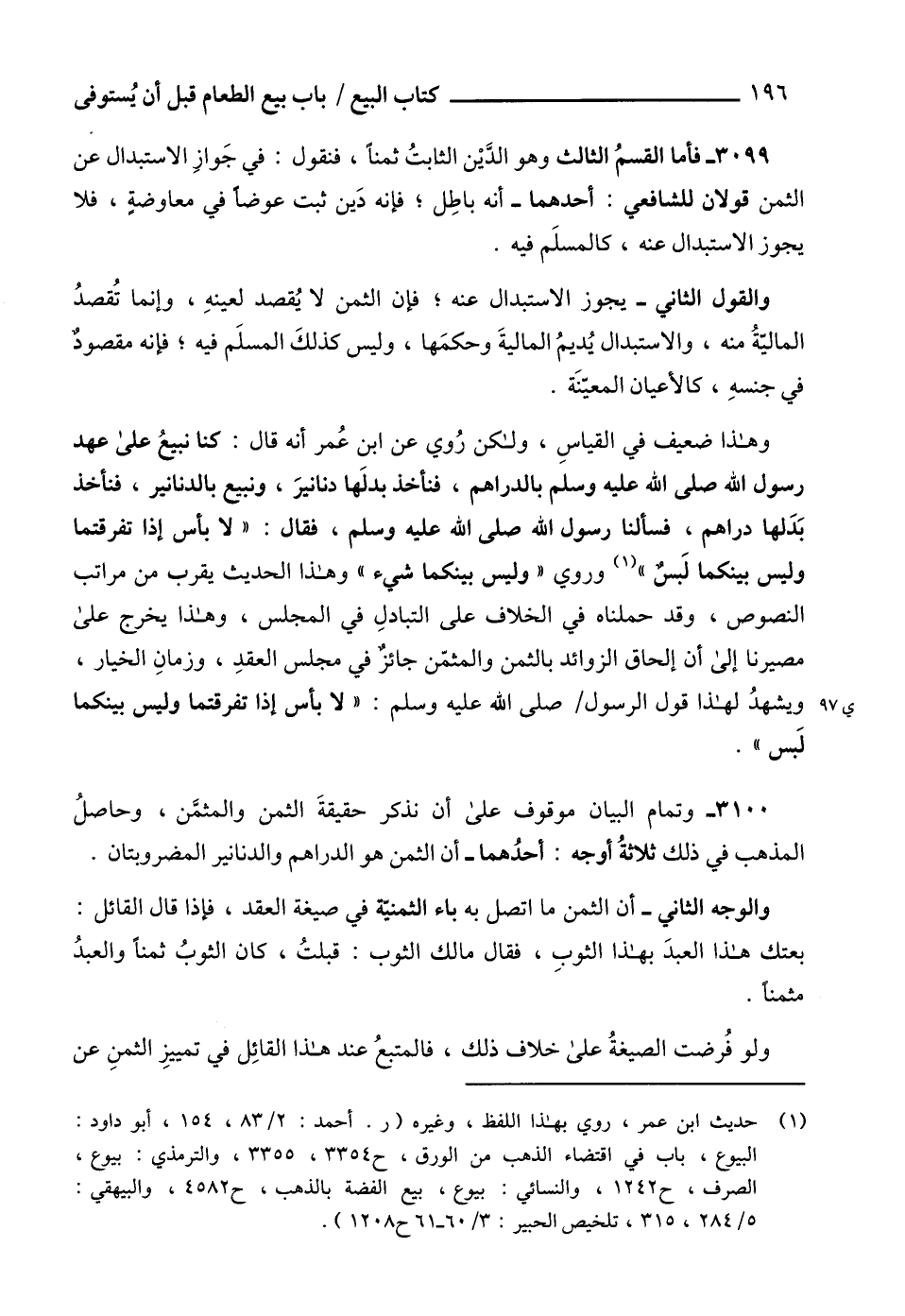 3100 - وتمام البيان موقوف على أن نذكر حقيقةَ الثمن والمثمَّن، وحاصلُ المذهب في ذلك ثلاثةُ أوجه: أحدُهما - أن الثمن هو الدراهم والدنانير المضروبتان.