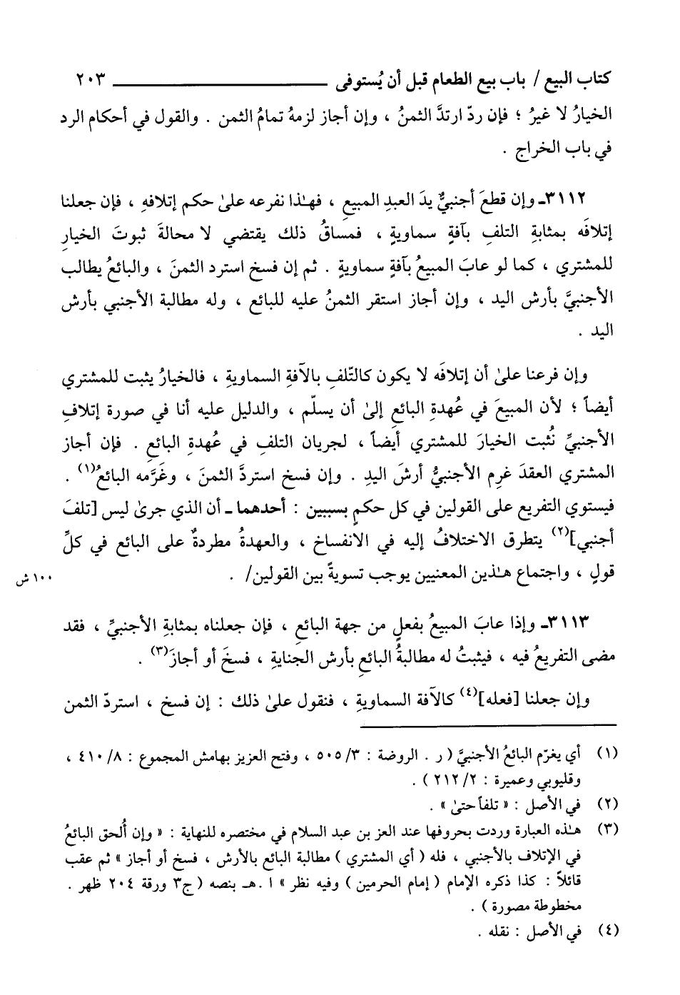 (3) هذه العبارة وردت بحروفها عند العز بن عبد السلام في مختصره للنهاية: "وإن أُلحق البائعُ في الإتلاف بالأجنبي، فله (أي المشتري) مطالبة البائع بالأرش، فسخ أو أجاز" ثم عقب قائلاً: كذا ذكره الإمام (إمام الحرمين) وفيه نظر" ا. هـ بنصه (ج 3 ورقة 204 ظهر.